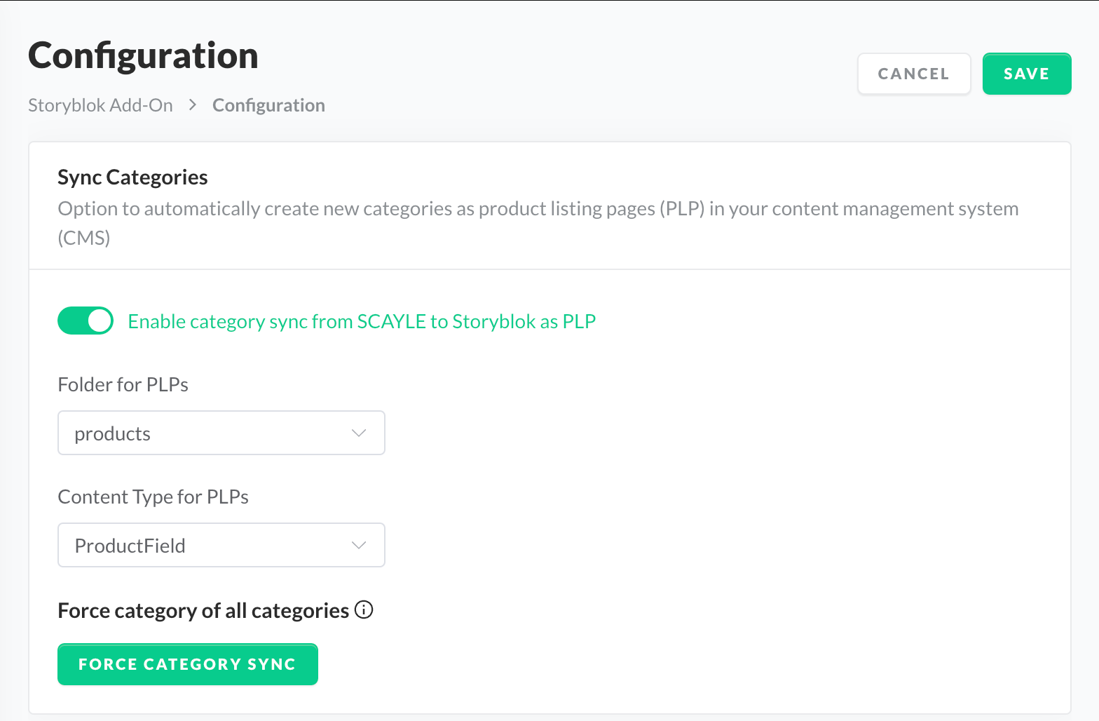 - Optionally: Force an update of all categories e.g. for initially importing all categories as PLPs in Storyblok.