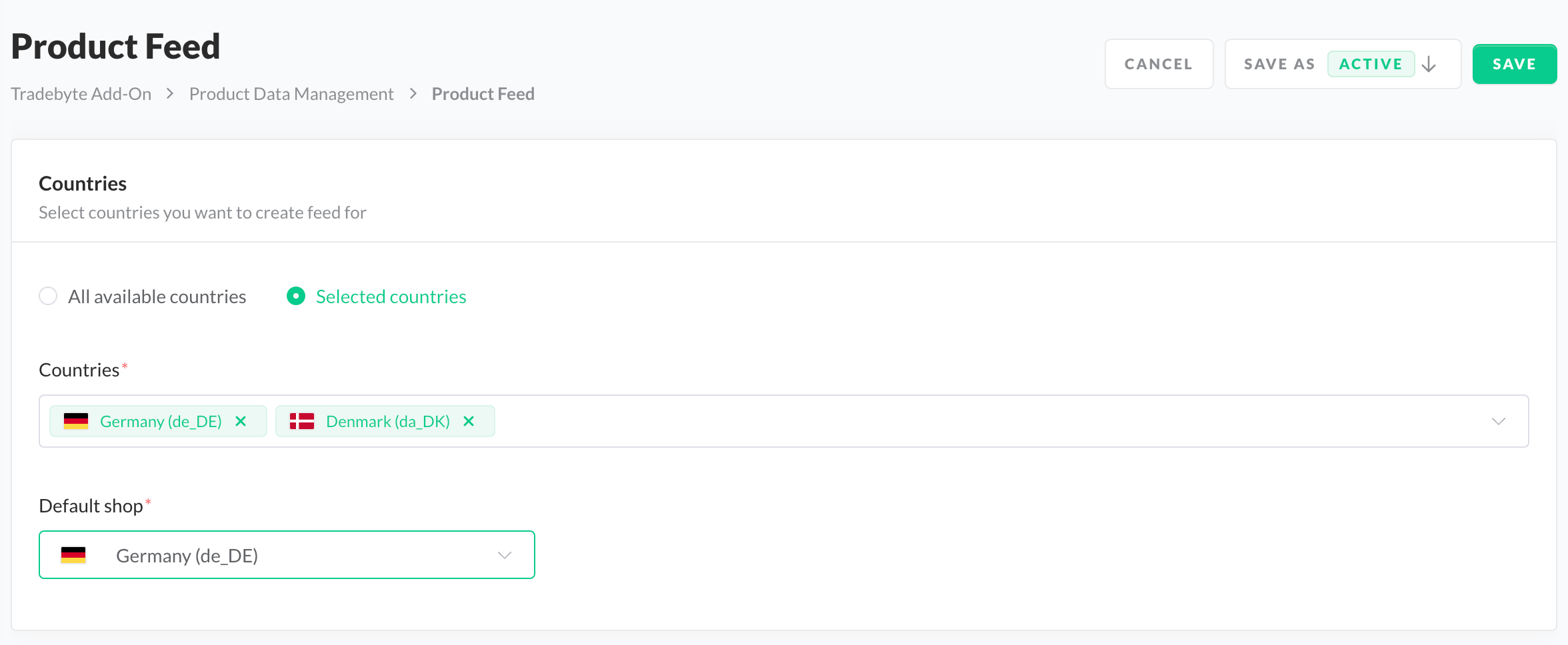 The Add-on creates one single feed file for syncing the product feed to TB.One in the Panda CSV format. TB.One mandates to select a default shop for creating the structure of the Panda file with the other country feeds merged to create the consolidated product feed.