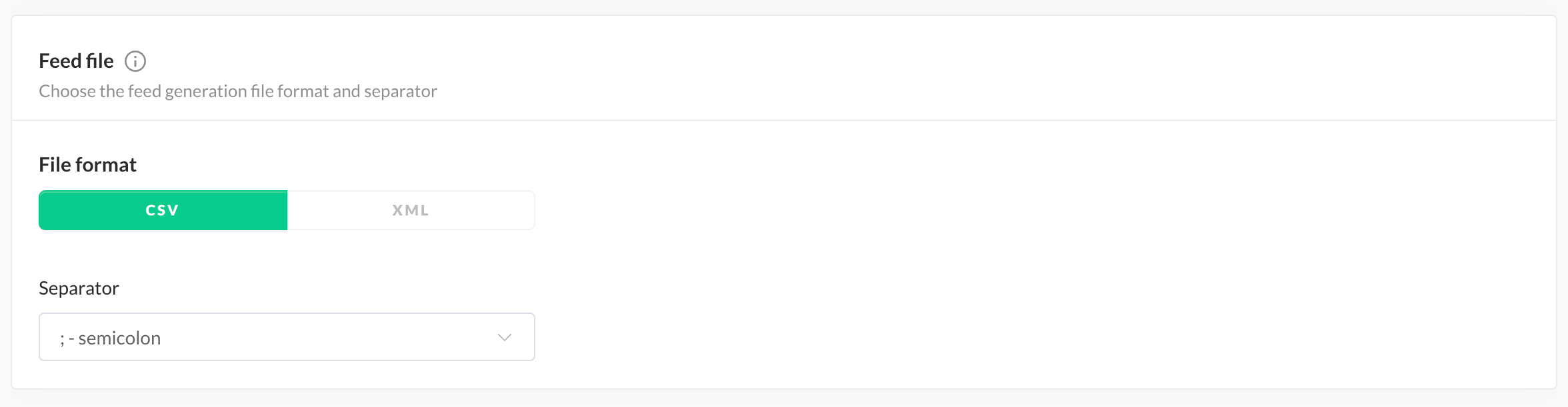 In this section, you can pick the format the feed file should be generated. The Add-on currently only supports the generation of CSV files for syncing with Tradebyte. You can pick the separator from the predefined options - comma (,), semi-colon (;), or pipe (|). It is set to semicolon by default.