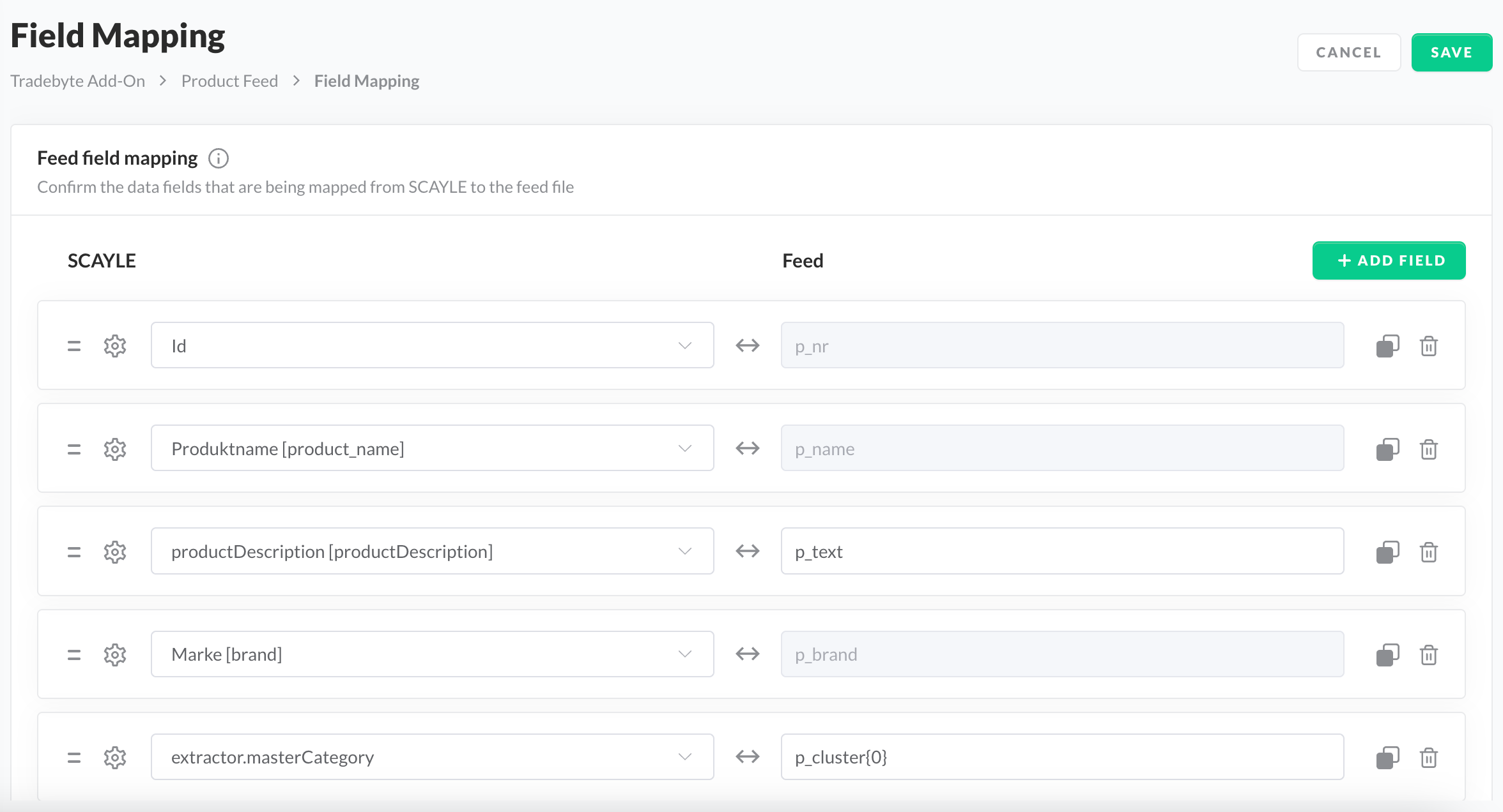 - Go to SCAYLE Panel ➜ Add-ons ➜ Tradebyte Add-on ➜ Product Feed ➜ Field Mapping.