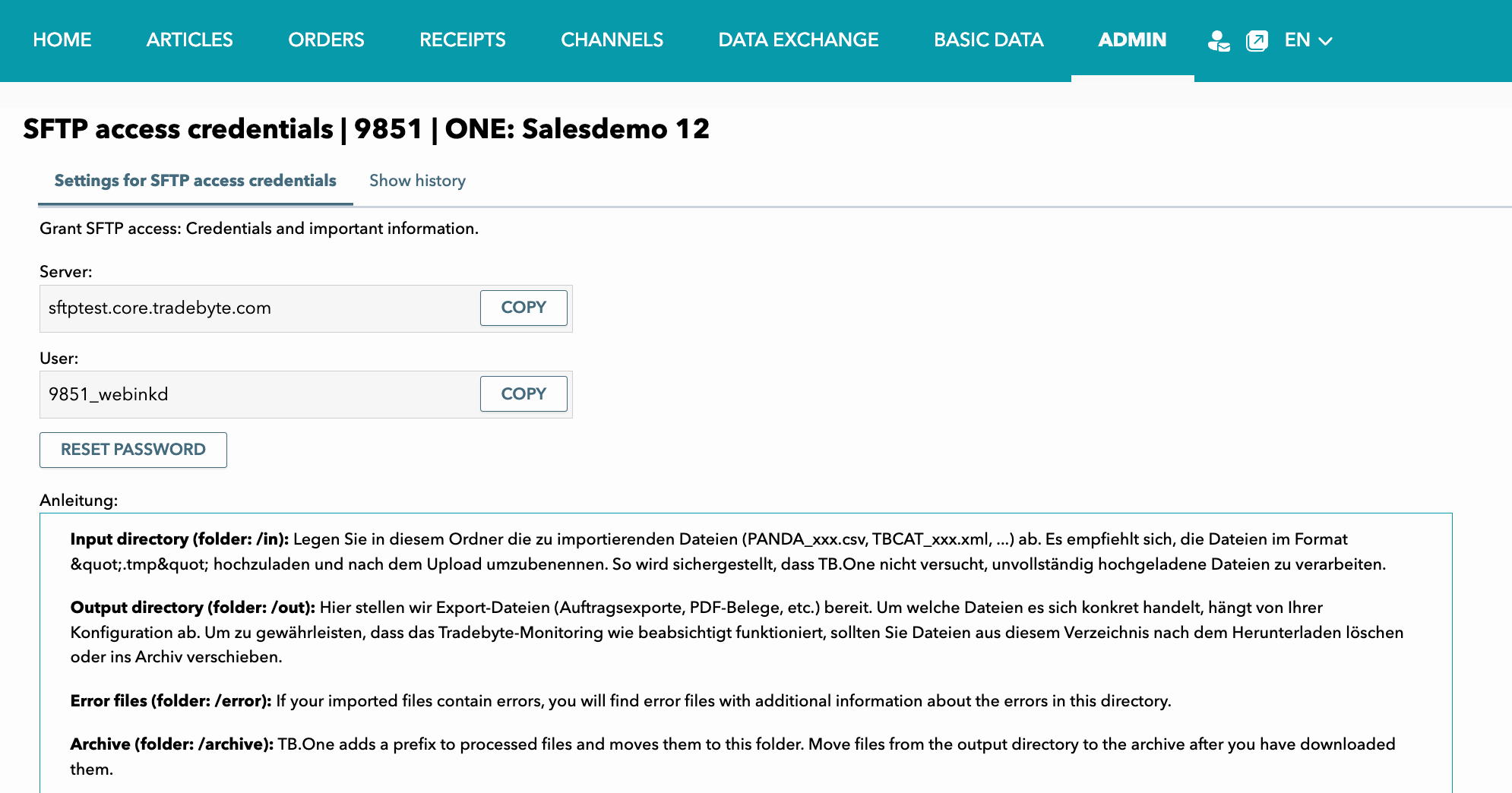 Your TB.One SFTP server is now set up. Next, you must enter these credentials in the SCAYLE Panel ➜ Add-ons ➜ Tradebyte Add-on ➜ Configurations.