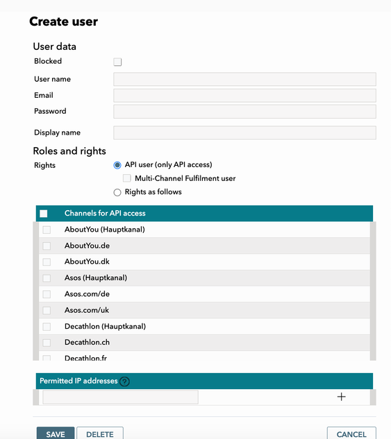 - Under Roles and rights, select API User (Do not select Multi-Channel Fulfilment user option).