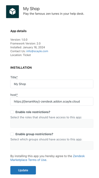 In the app center of Zendesk you can find and configure the SCAYLE Zendesk app.