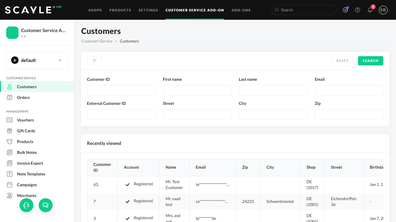 You can view customer-specific information in the Customer area - SCAYLE Panel → Add-ons → Customer Service Add-on → Customers – and search for individual customers on the overview page. Details on how to search for customers are listed in the section Search Customers.