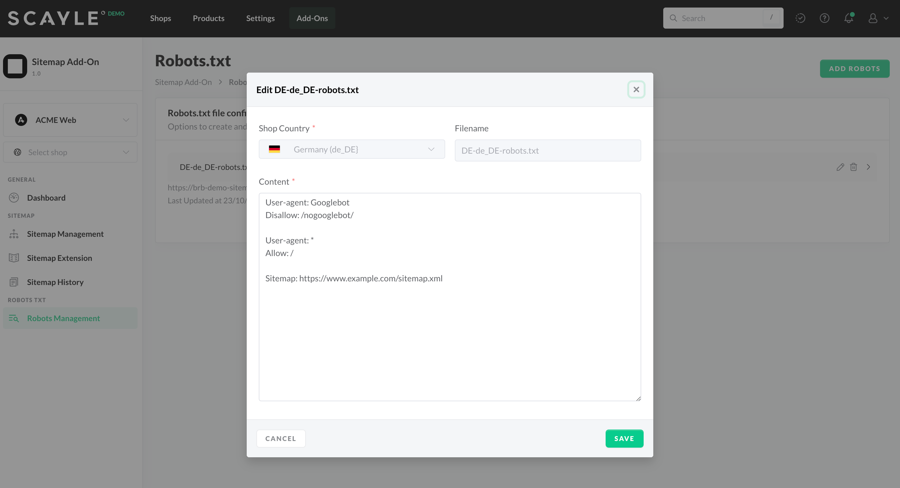 - Go to Add-ons ➜ Sitemap Add-on ➜ Robots Management.