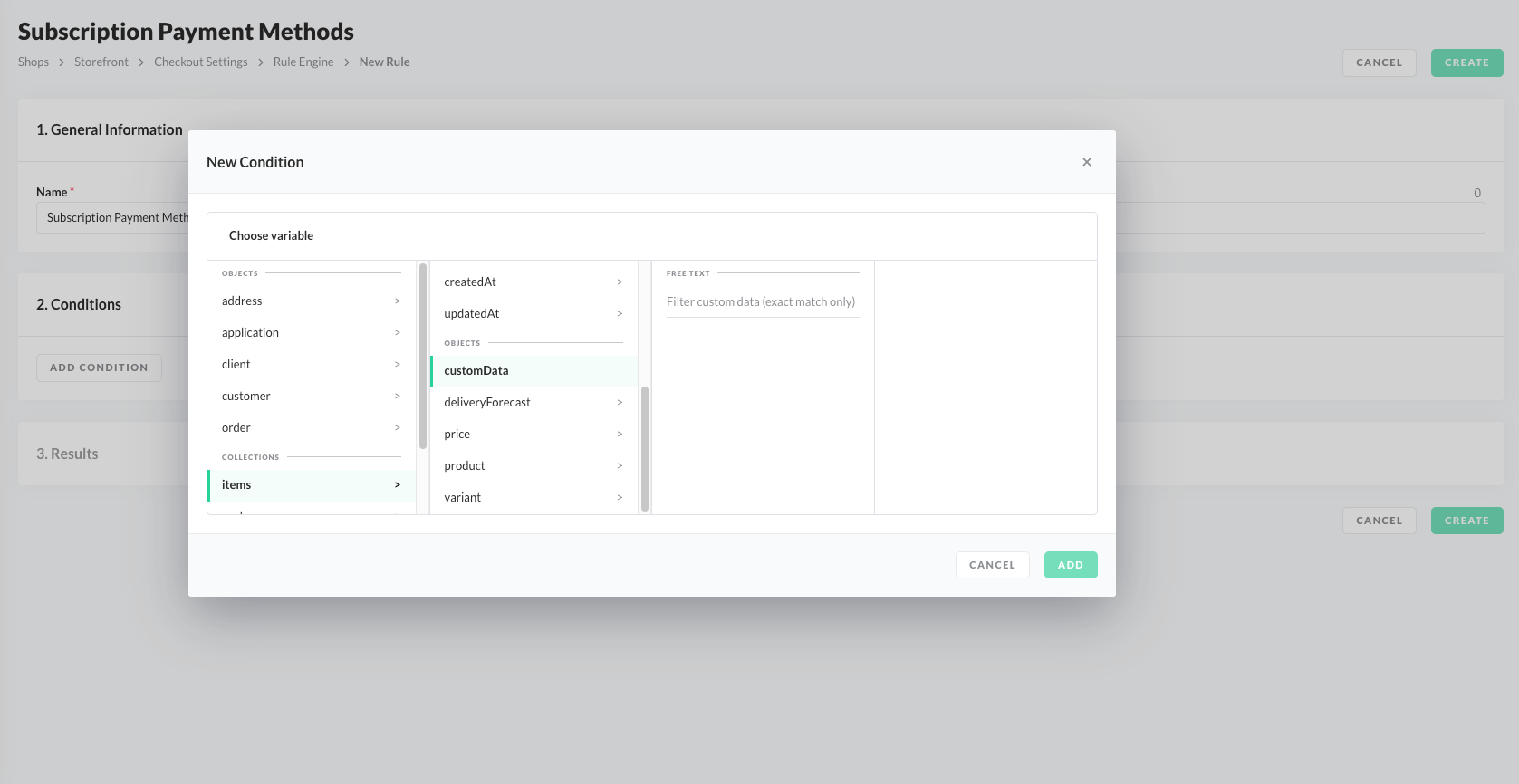 items➜customData➜subscriptionDefinition. - When the variable selection is complete, click ADD.