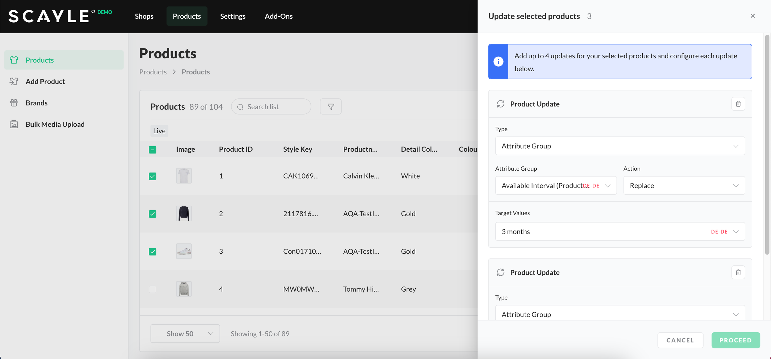 Define which attribute group should be updated and set the target value. Select Proceed to update the selected products.