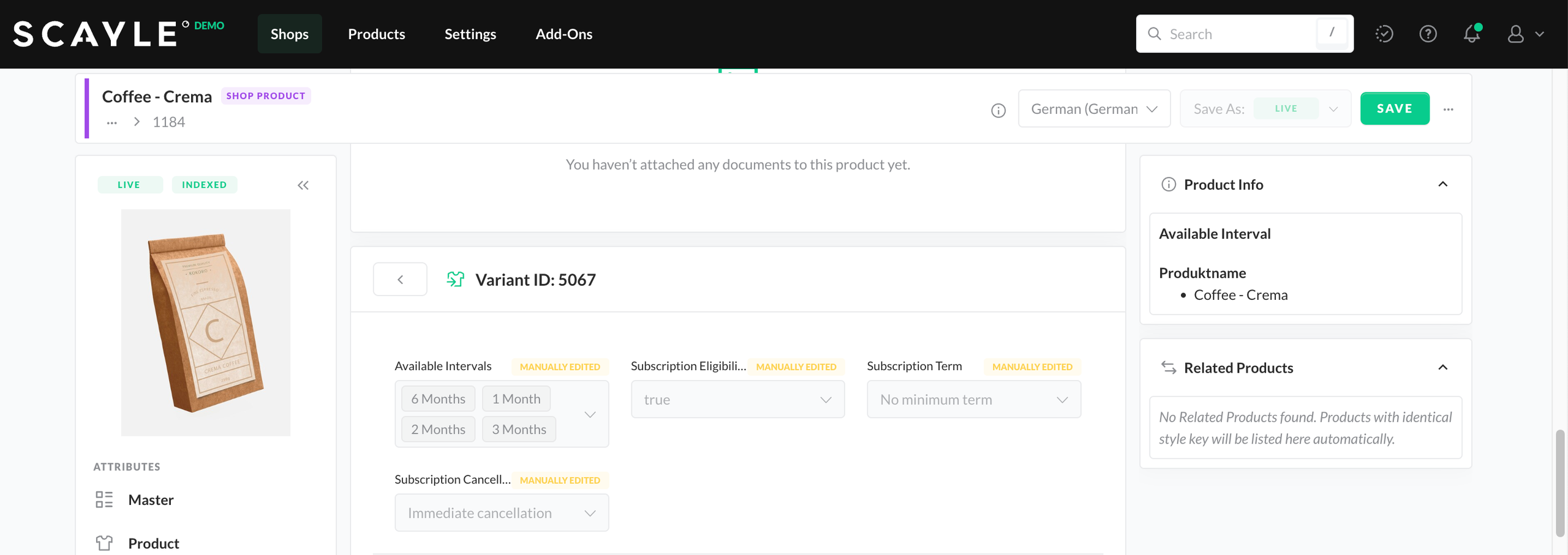 To edit the subscription attribute values for a single product or variant, navigate to Shops ➜ [Shop] ➜ Products and select the product that you would like to edit. Select the attribute - either on product level or by selecting the associated variant - and set the desired value.