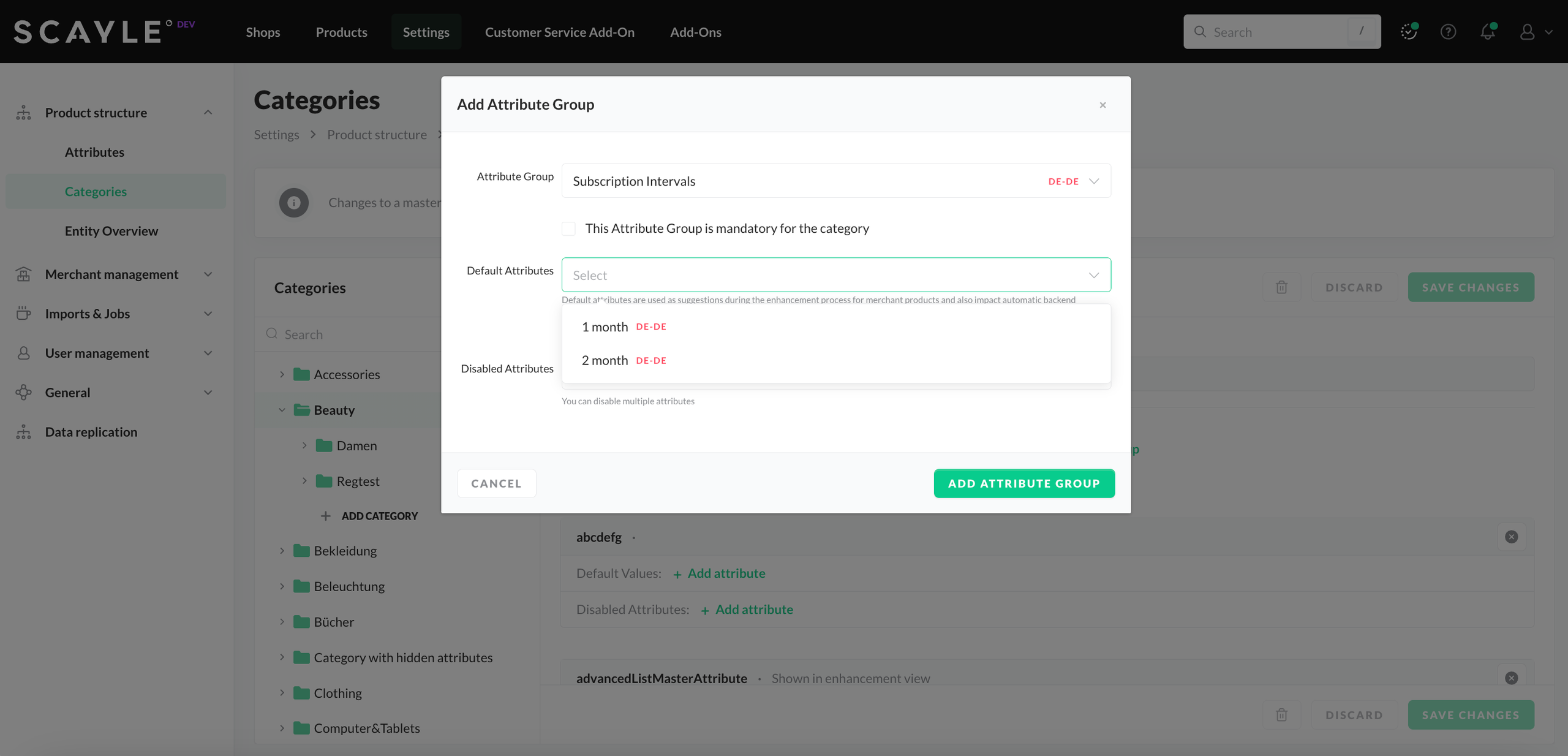 The product attributes are used in order to define which products allow subscriptions, what delivery intervals are available for the different subscription products, and which discounts should apply to subscriptions. To create attribute groups and add them to product categories, navigate to Settings ➜ Product Structure ➜ Attributes in the SCAYLE Panel.