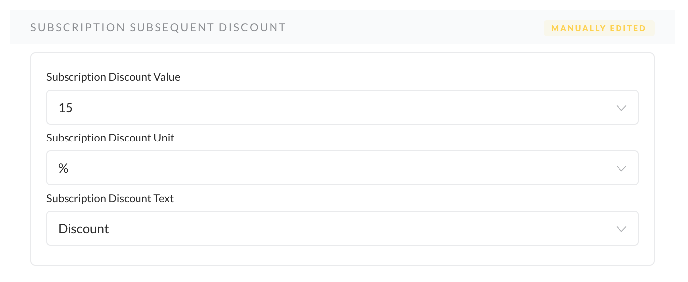 Subsequent discounts can be defined per variant and different subsequent discounts can be set for the same variant in different shop countries (depending on how the attributes was set up as part of the attribute creation for subscriptions).