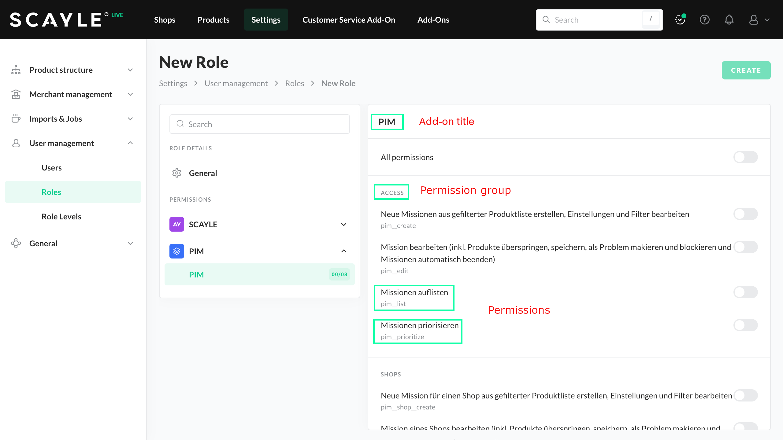 Each Add-on defines its own permissions. They are published to the SCAYLE Panel via the Add-on API. Permissions can then be assigned to roles, which are attached to users, using the SCAYLE Panel.