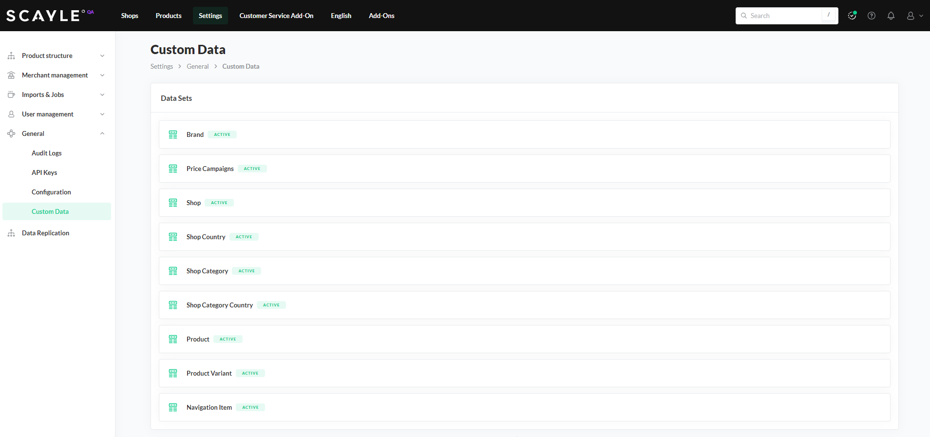 Manage custom data in the SCAYLE Panel Settings area: Settings ➜ General ➜ Custom Data.