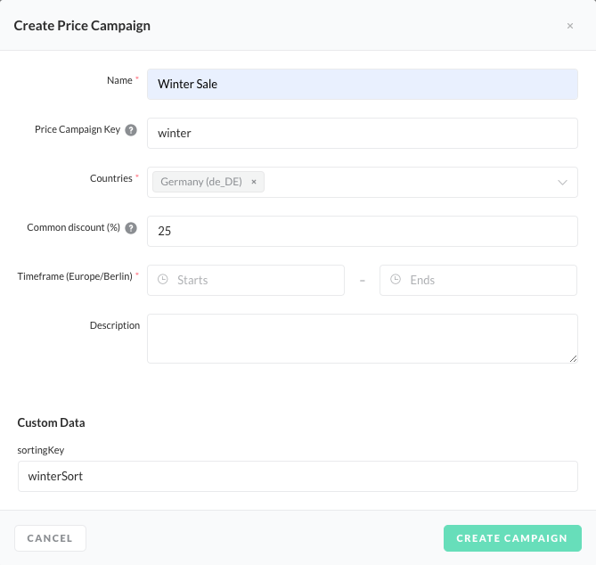 The parameter will then be shown as part of the price campaign creation (see image below).