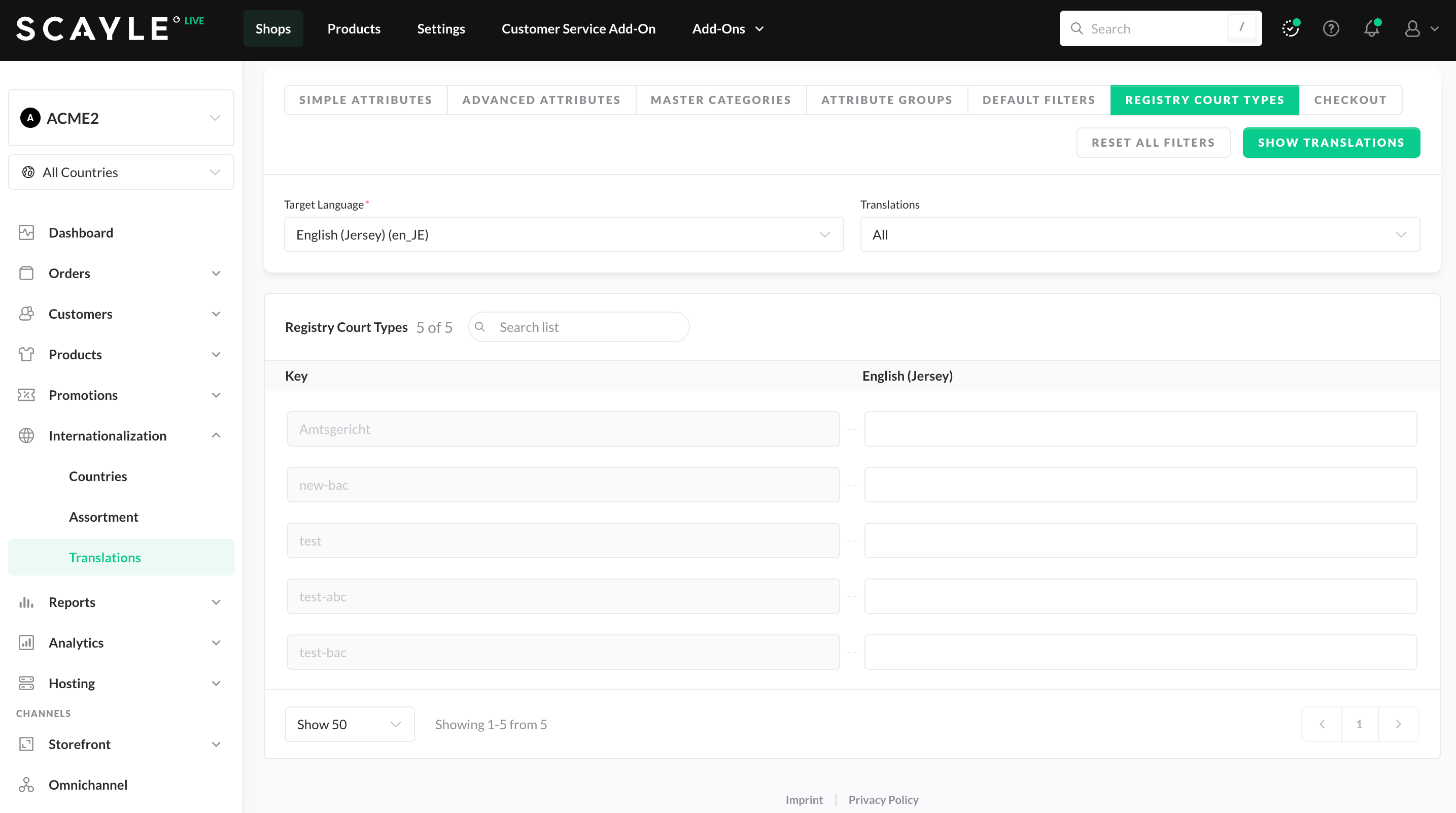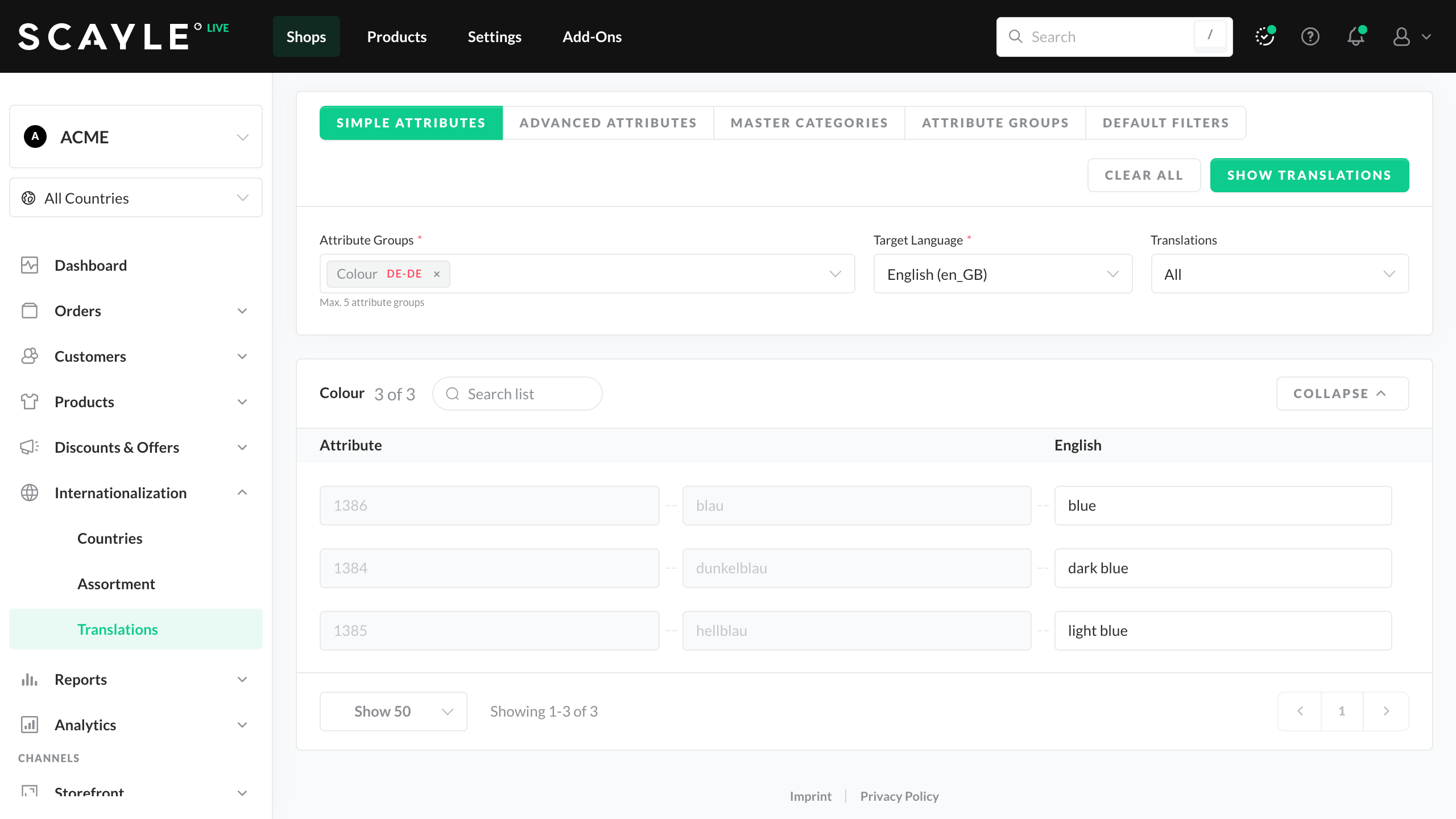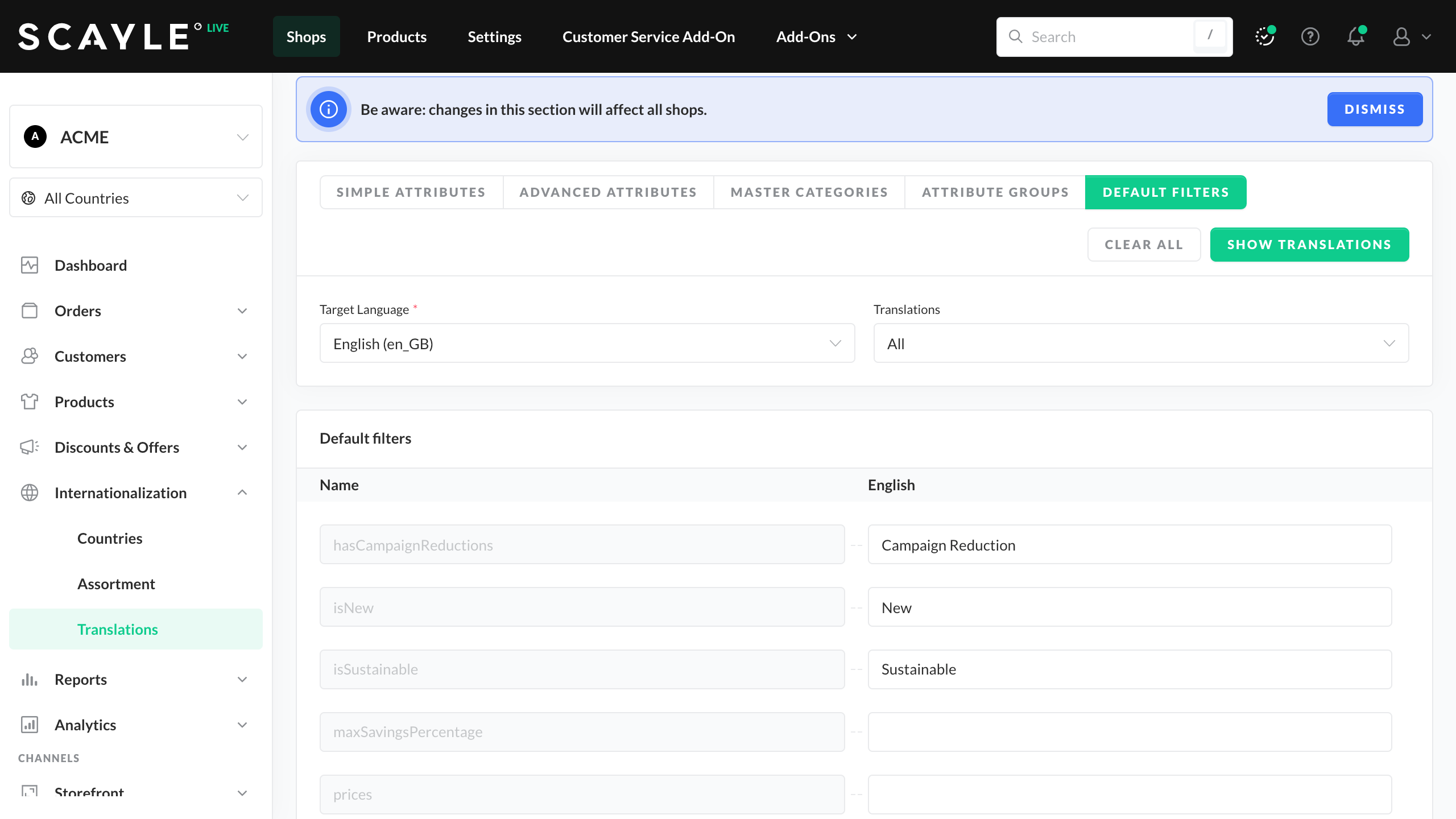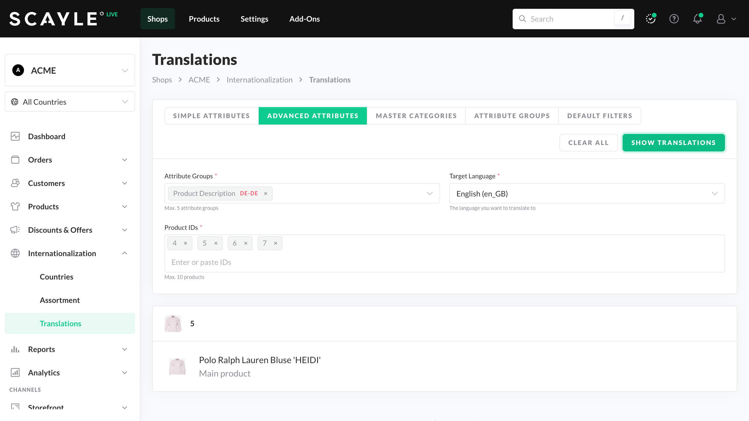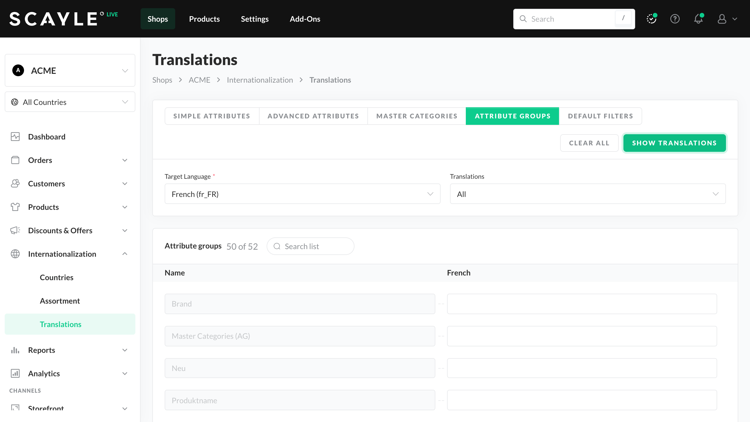 You can enter missing translations step-by-step and edit the displayed list. Even though shops within SCAYLE only support one language at a time, you can manage multiple shops with the same language simultaneously. Thus, once you have saved your translations, they are automatically applied to all existing shops using the same language.