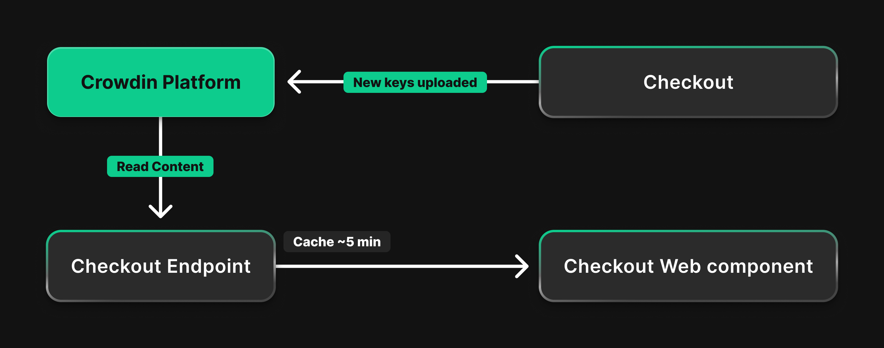 Translations are collected and released through the Crowdin platform, then dynamically loaded into Checkout.
