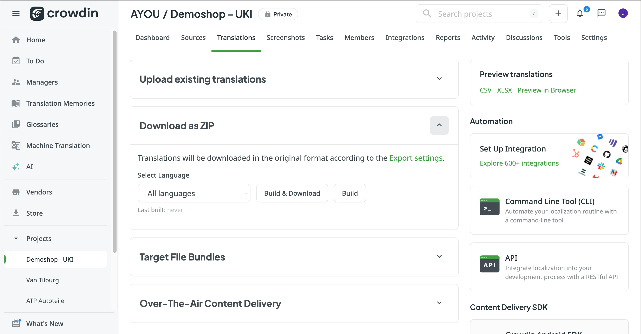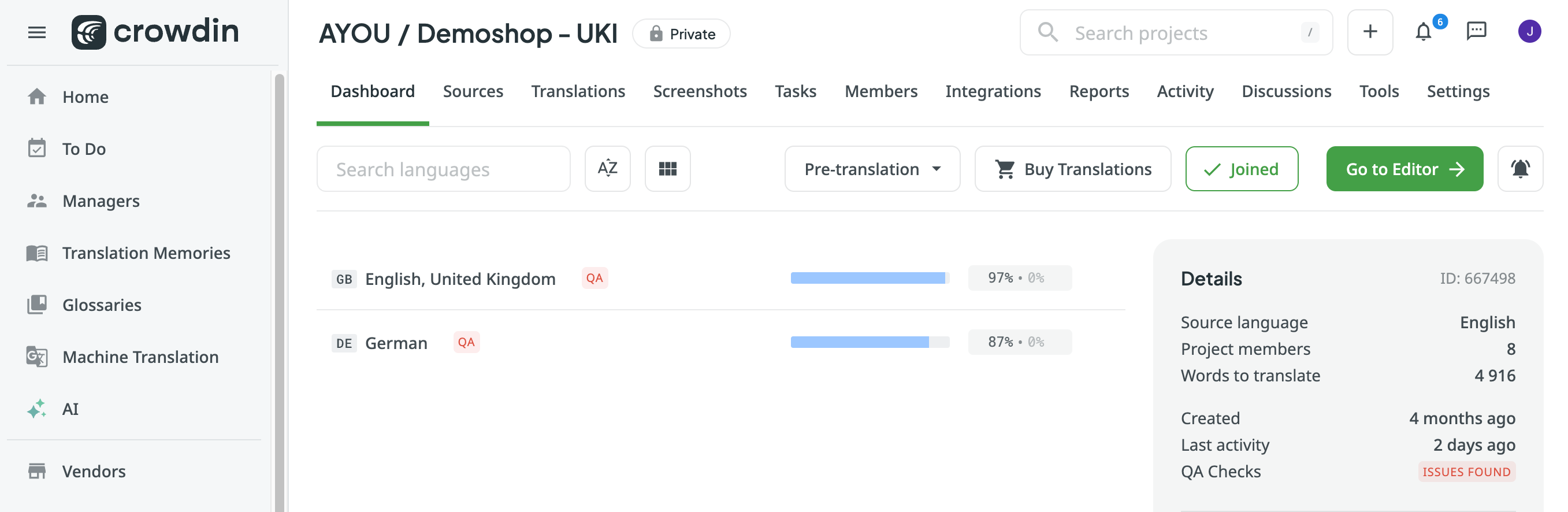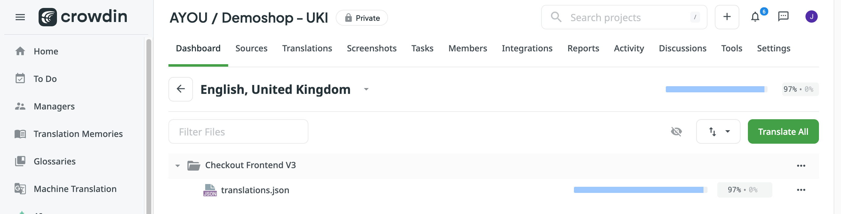 - On Crowdin home, select the tab translations