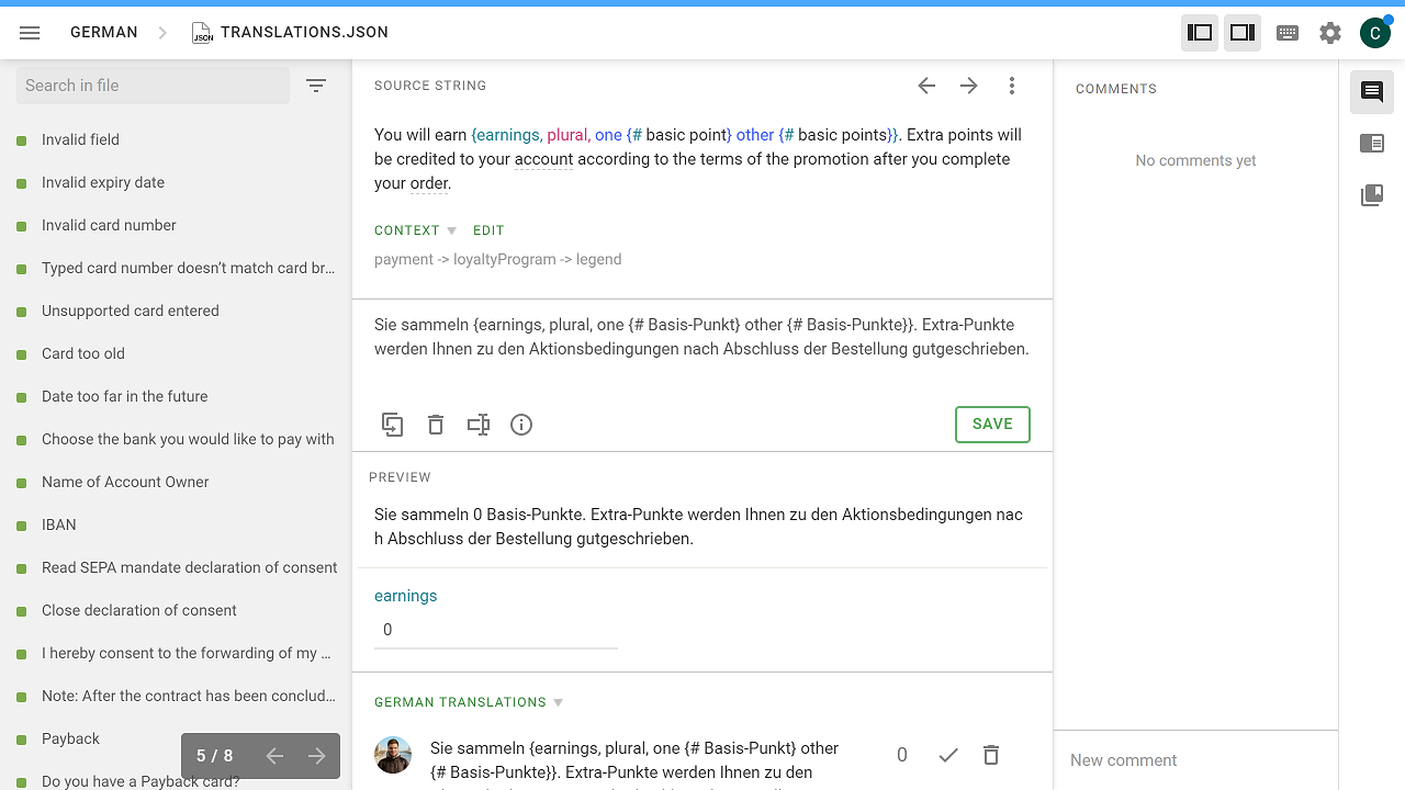translations.jsonin a language folder and a mask opens with strings that you can translate. Choose a string and add the translation.