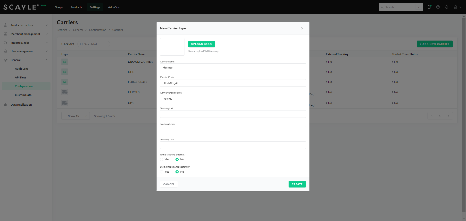 You can do this in the SCAYLE Panel under Settings ➜ General ➜ Configuration ➜ Carriers ➜ Add New Carrier.