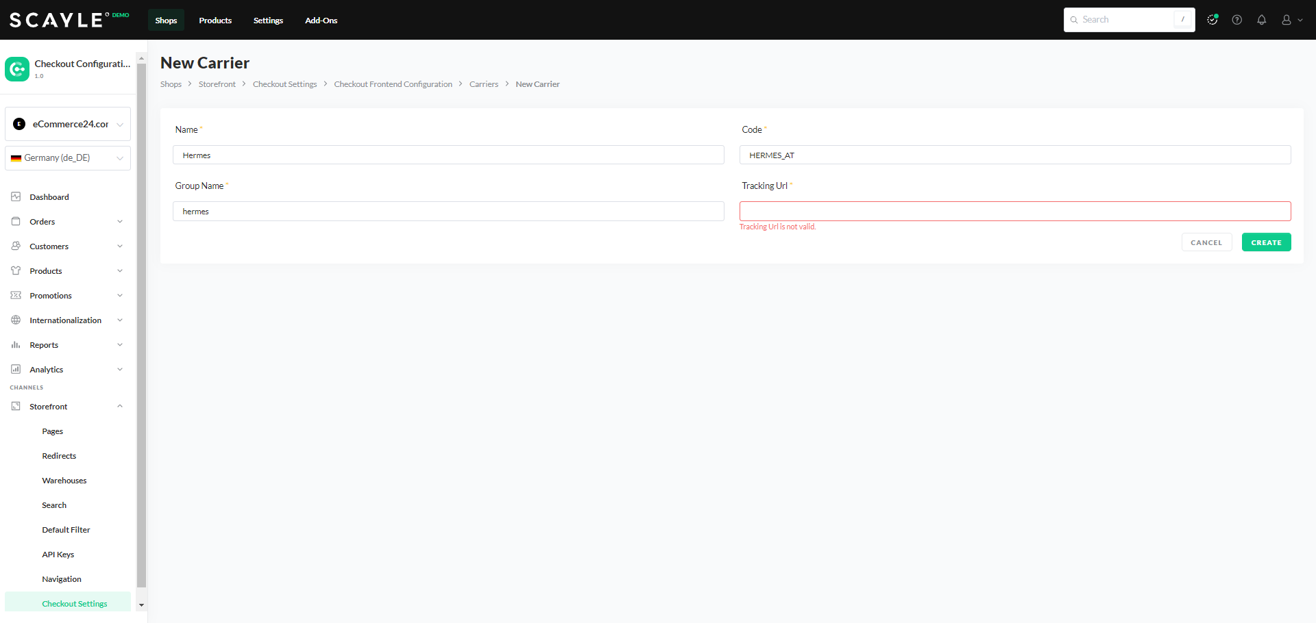 carrierGroupKey ( Group Name) | ✅ | hermes | Defines how the carrier is visually presented during the Checkout flow. It determines the carrier’s logo and translation key that are pre-configured by SCAYLE |