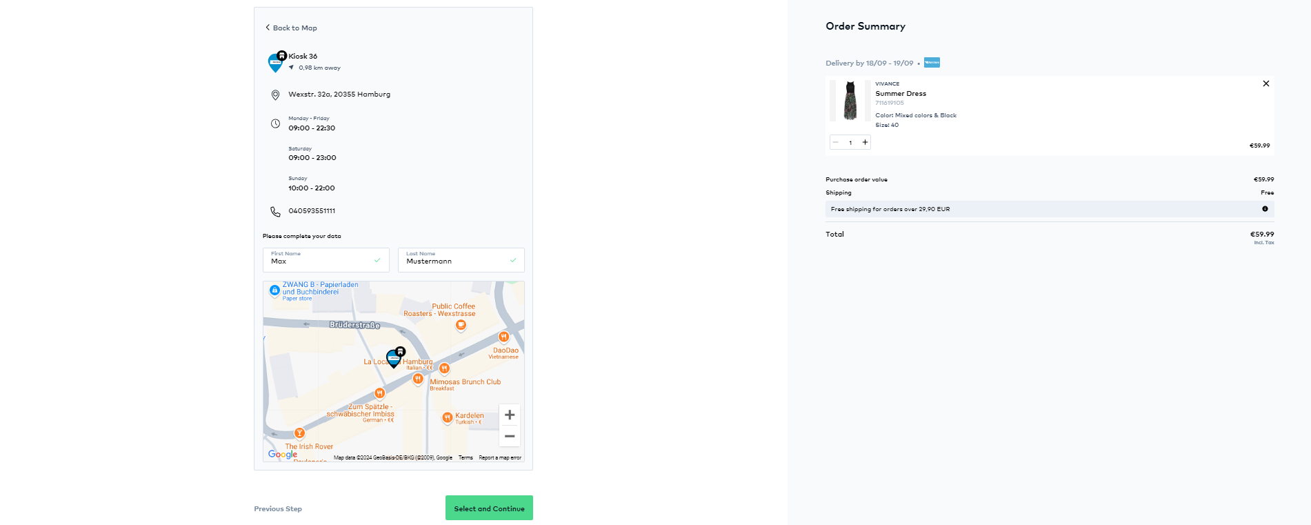Clicking the "Select and Continue" button sends the selected Collection Point and its data to the logistics system once the order is confirmed.