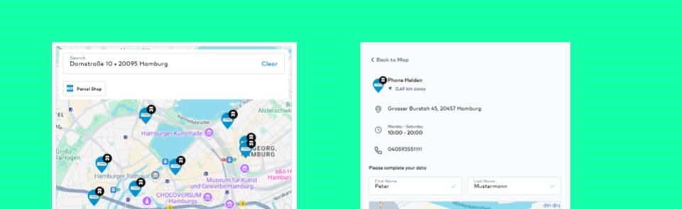 If a customer clicks on one of the displayed Collection Points, the Checkout Webcomponent will open a detailed view of the respective Collection Point. Through customization, additional customer data such as Carrier Customer ID, Logistic Phone Number, or Customer Name can be obtained.