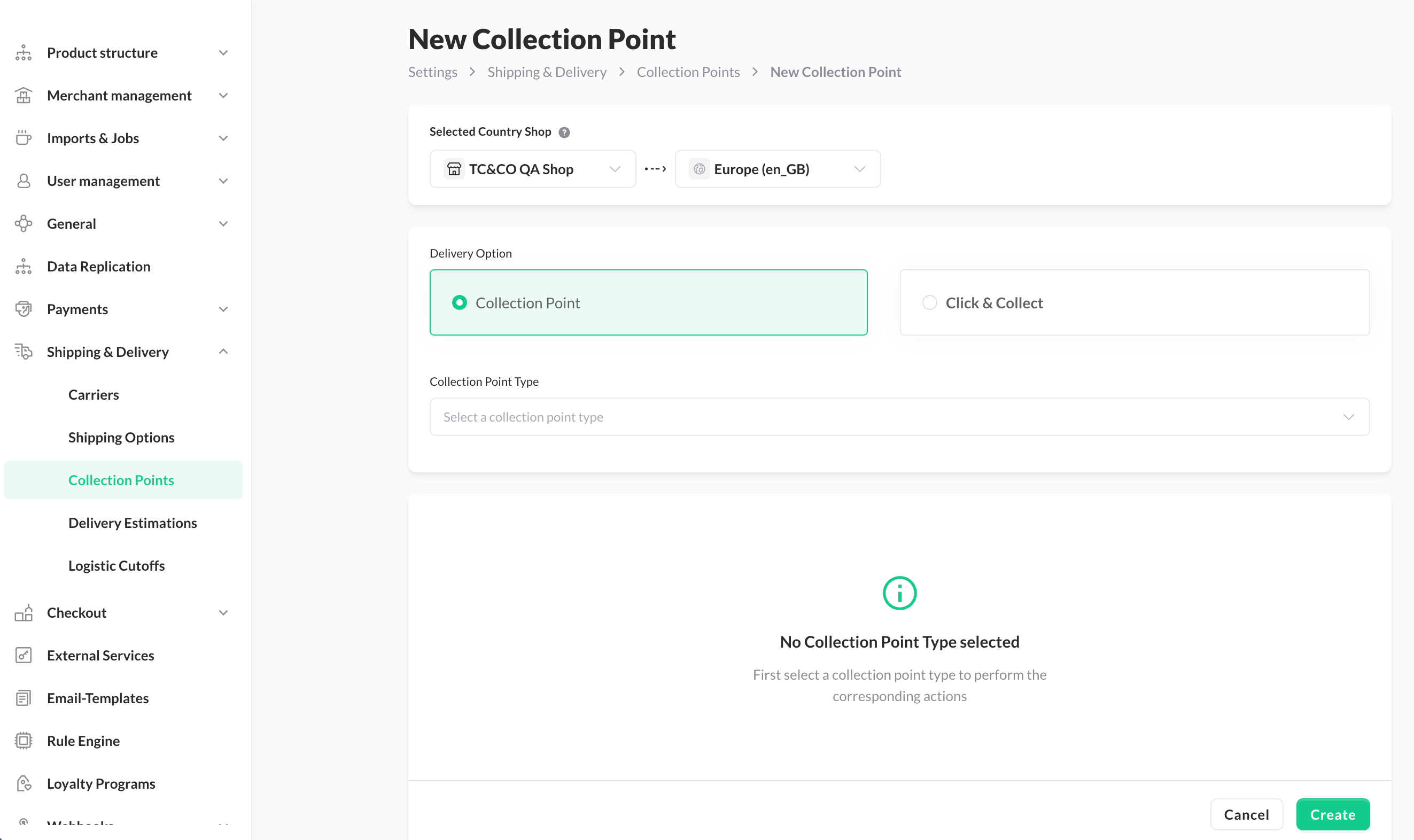 Collection Point Types are configured globally. Once set up, you can add and configure these Collection Point Types individually for different shop countries and its Checkout Experiences.