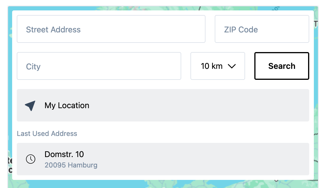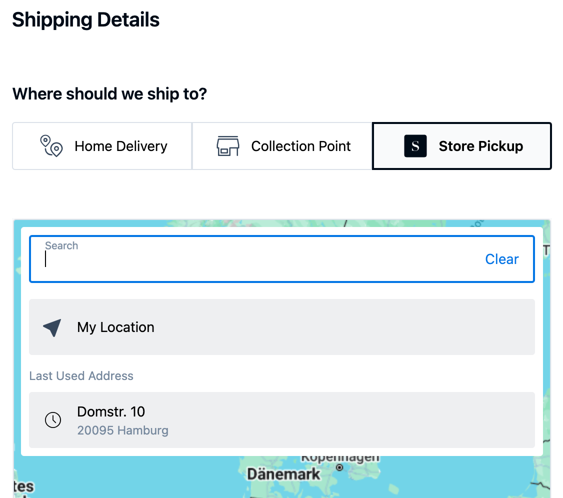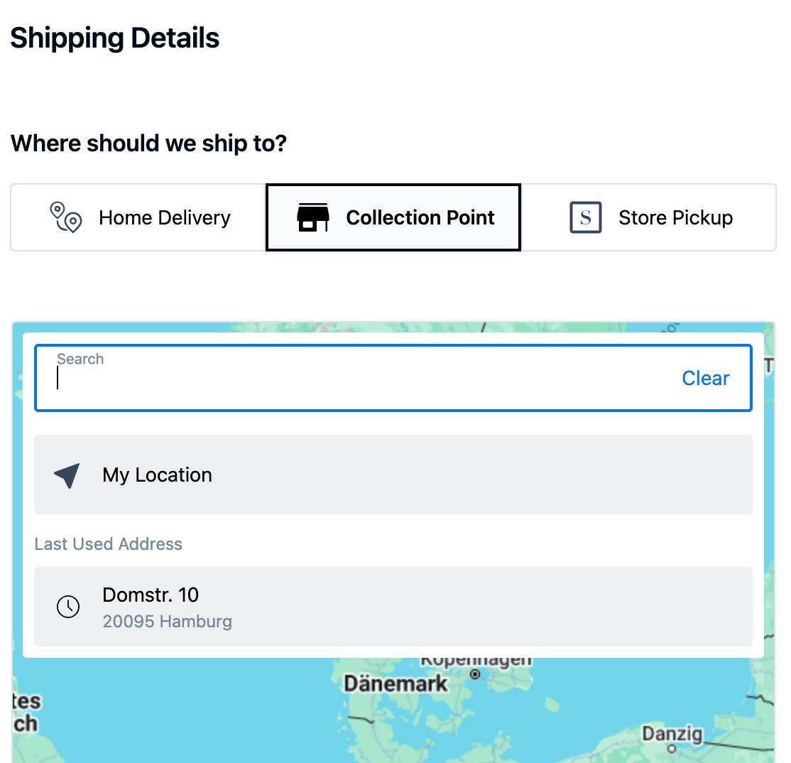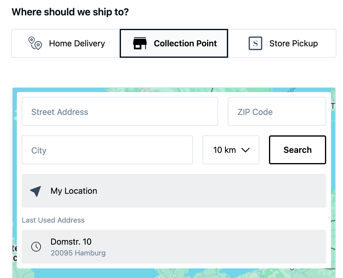 When a customer enters an address in the Collection Point Search, options within a predefined radius are shown. Both the default selection and more detailed options in the dropdown can be individually configured.