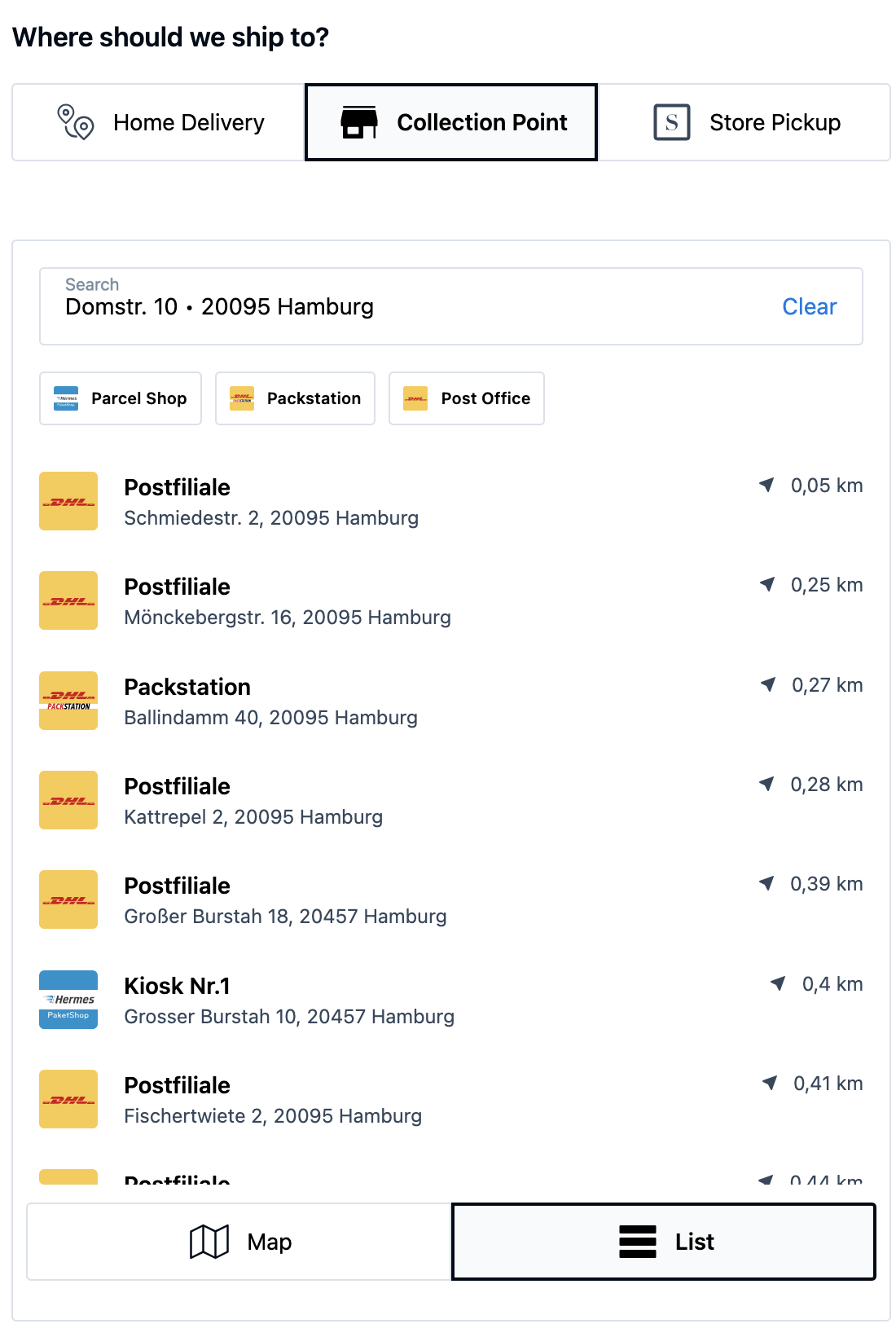 When customers search for a Collection Point, the results can be displayed either on a map or as a list. You can easily toggle between these options in the SCAYLE Panel. For default configurations, please refer to the Checkout defaults.