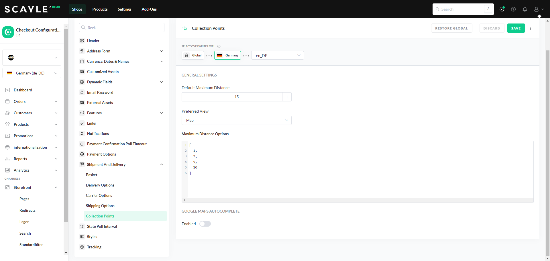 To enable Google Autocomplete, simply turn on the Google Maps Autocomplete toggle. SCAYLE will automatically apply internal API keys for the respective environment.