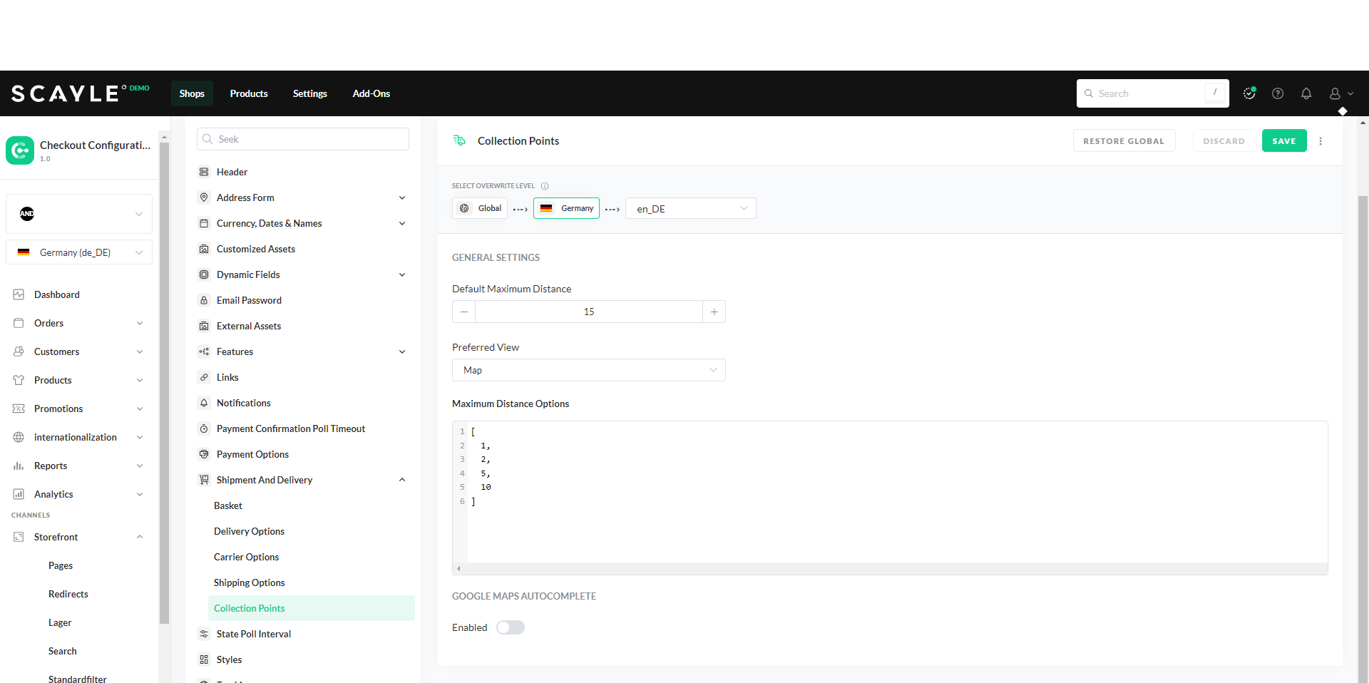 This can be done in the SCAYLE Panel under Settings ➜ Checkout ➜ Configurations ➜ Shipment & Delivery ➜ Collection Points.