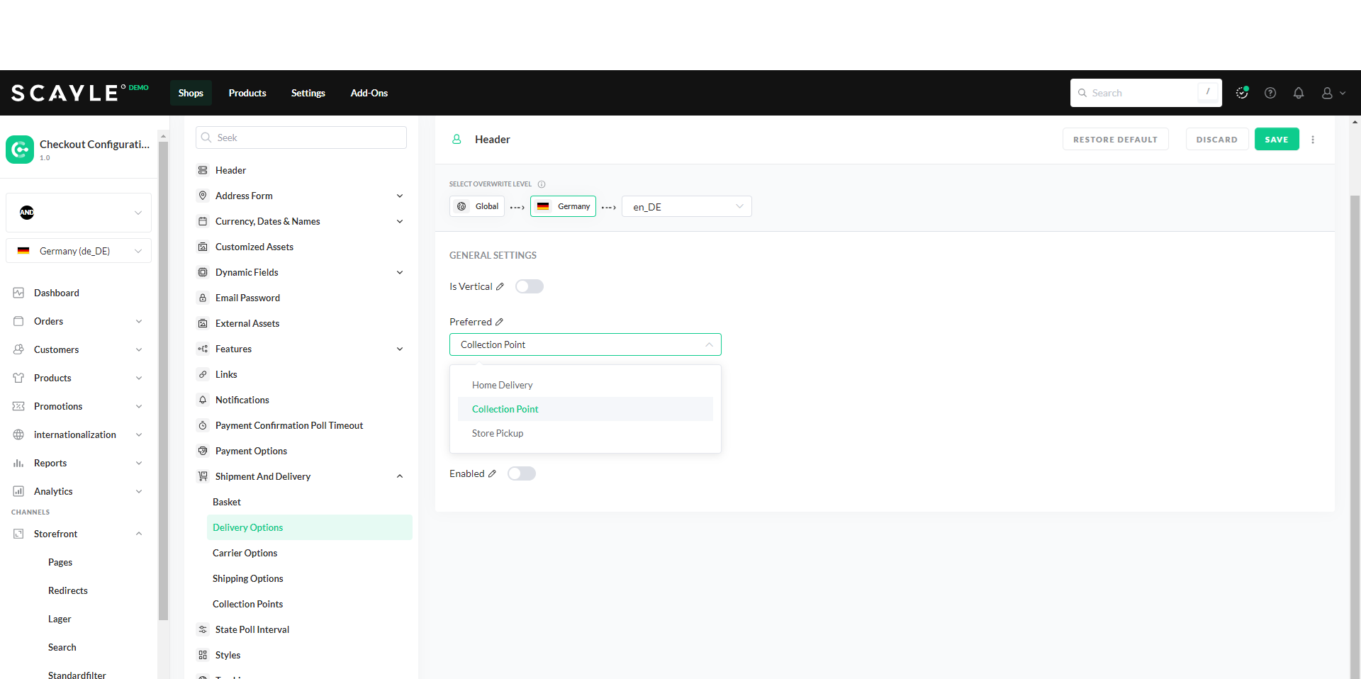 In the SCAYLE Panel go to ** Settings ➜ Checkout ➜ Configurations** locate Shipment and Delivery and click on Delivery Options. Here you can enable forwarding to collection points.
