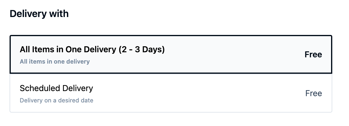 express_delivery- "Express Delivery"free_delivery- "Free Delivery"scheduled_delivery- "Scheduled Delivery"standard_delivery- "Standard Delivery"least_packages- "All Items in One Delivery"