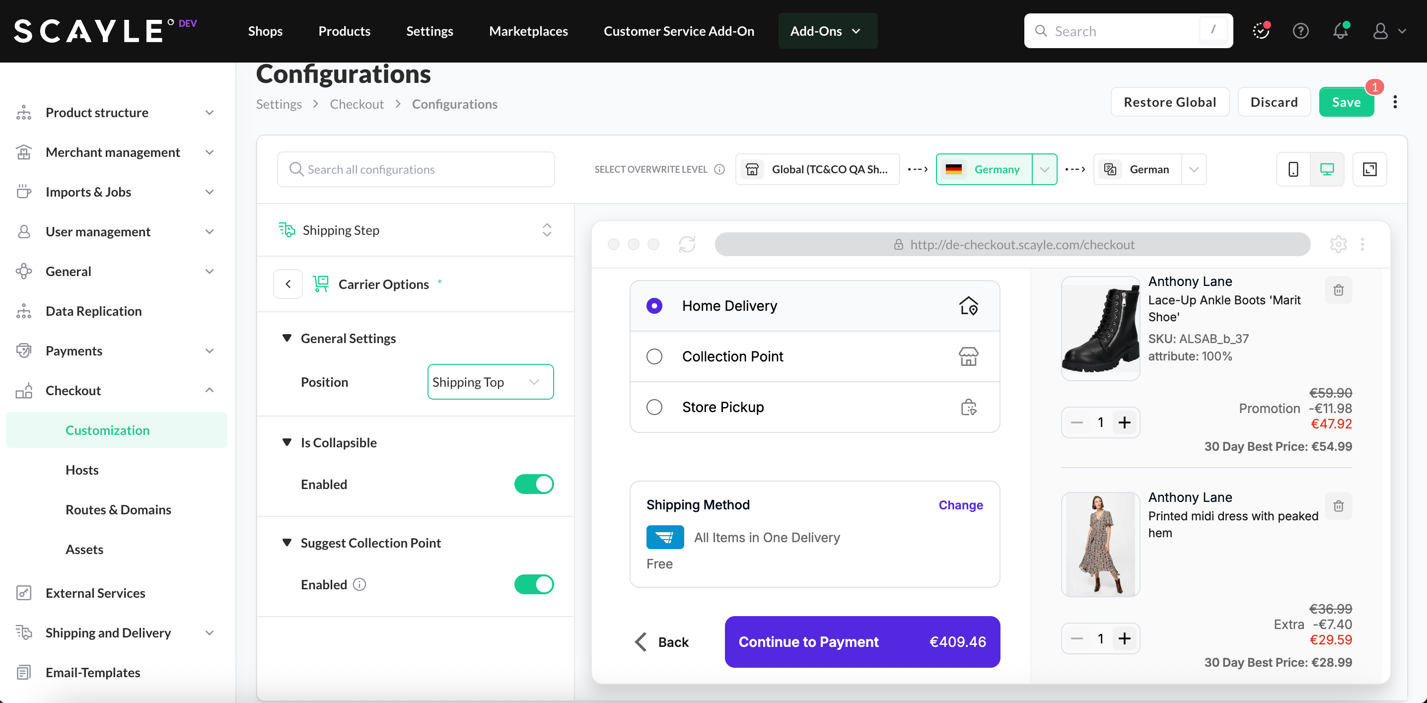 - Global: Any configuration changes made will be applied globally across all country shops within the SCAYLE Panel: