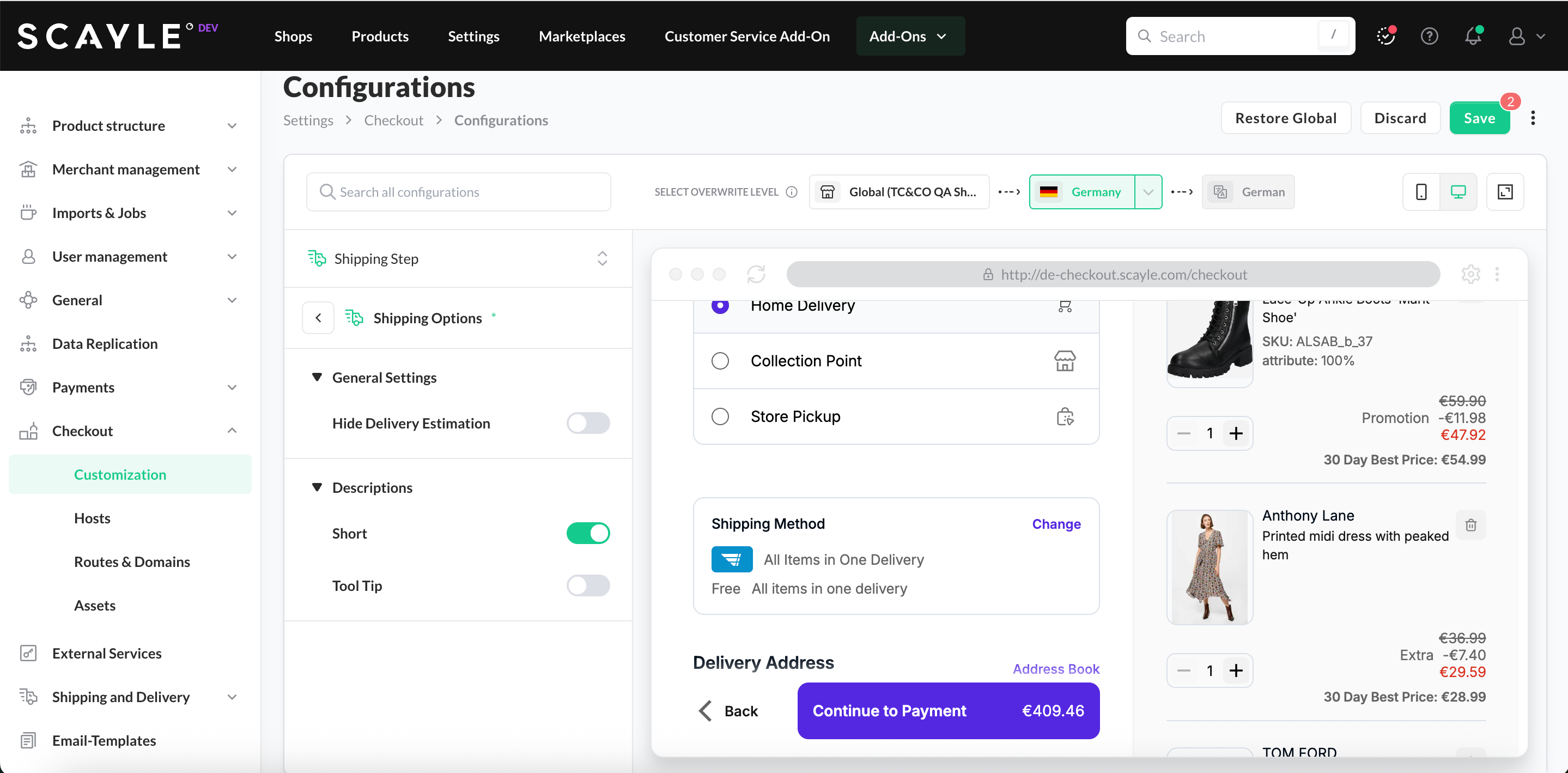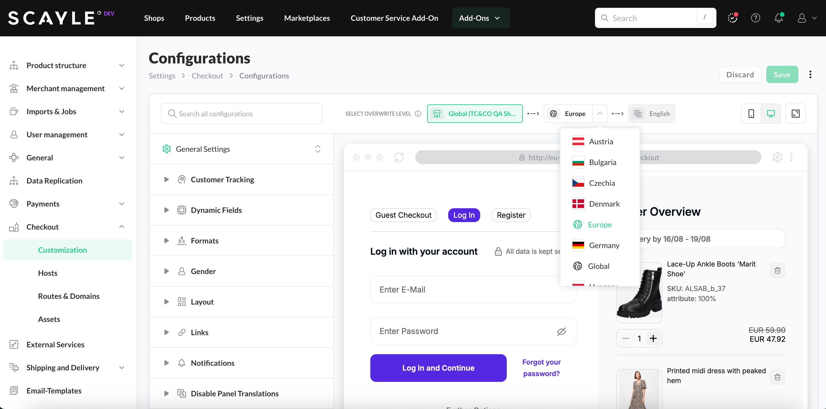The SCAYLE Checkout is designed to support a wide range of multi-country scenarios, allowing you to tailor the checkout experience to local requirements and regulations.
