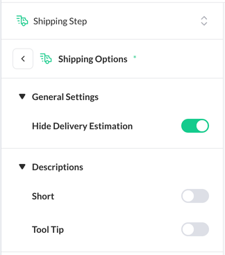 To disable delivery estimates for the Shipping Option component, select the shop-country and navigate to Shipping Step → Shipping Option in the configuration menu.