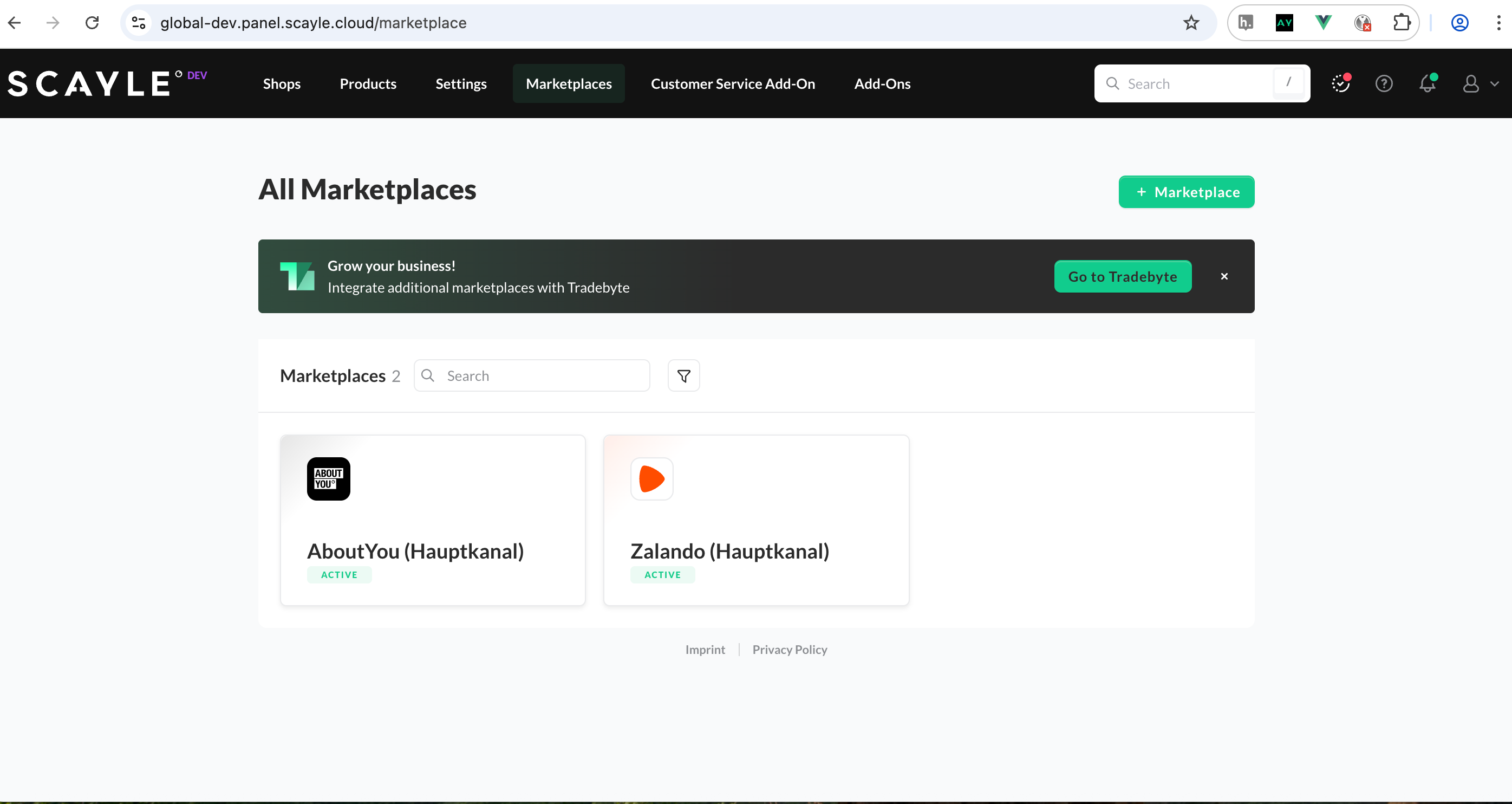The Marketplace management is integrated into the SCAYLE Panel under a dedicated top navigation point. Being able to see all configured marketplaces requires the permission marketplace__list .