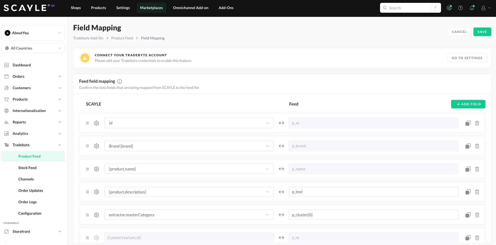This step ensures each marketplace receives the correct attribute set according to its individual requirements. - After SCAYLE Marketplace creation, the Product Feed automatically maps each SCAYLE shop country to every Tradebyte channel, meaning prices are sent from all SCAYLE shops to all Tradebyte channels. Currency is managed in Tradebyte per channel and is not included in the PANDA file.