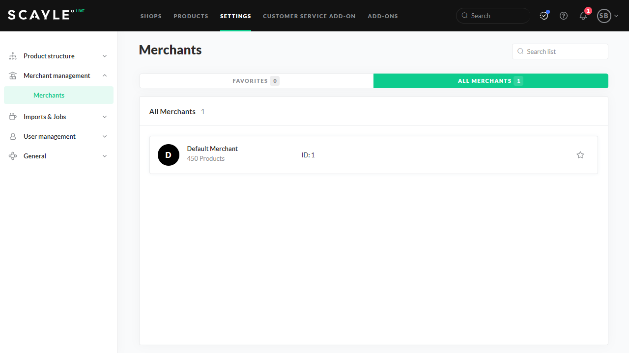 You can access the merchants overview section from Settings ➜ Merchant Management ➜ Merchants. The displayed list shows all merchants already connected to the system.