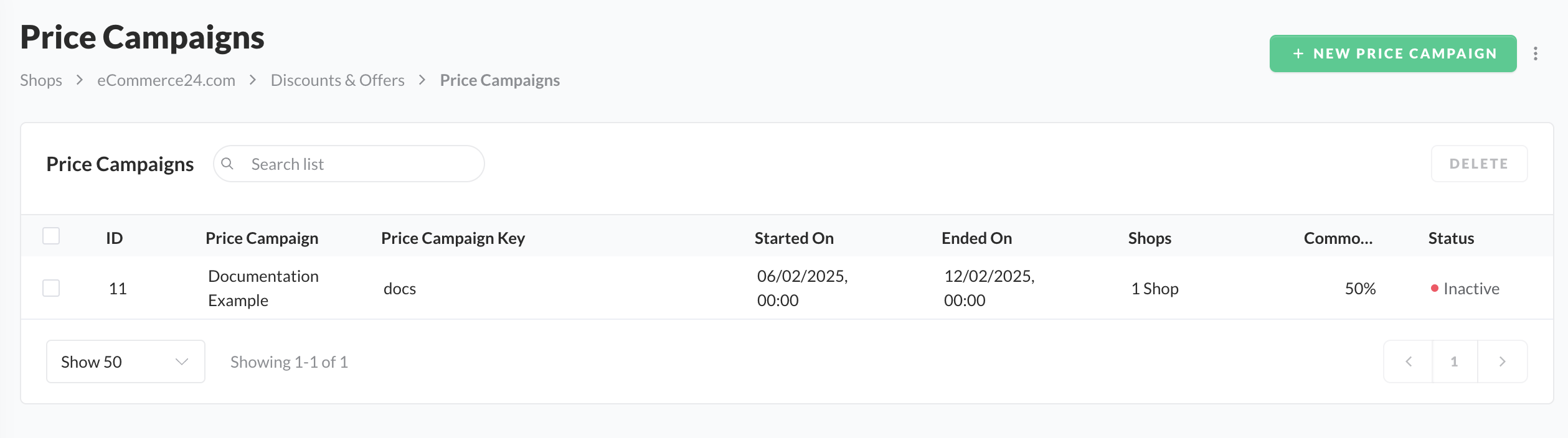 Here you will be able to see a list of existing Price Campaigns, manage them and create new Price Campaigns.