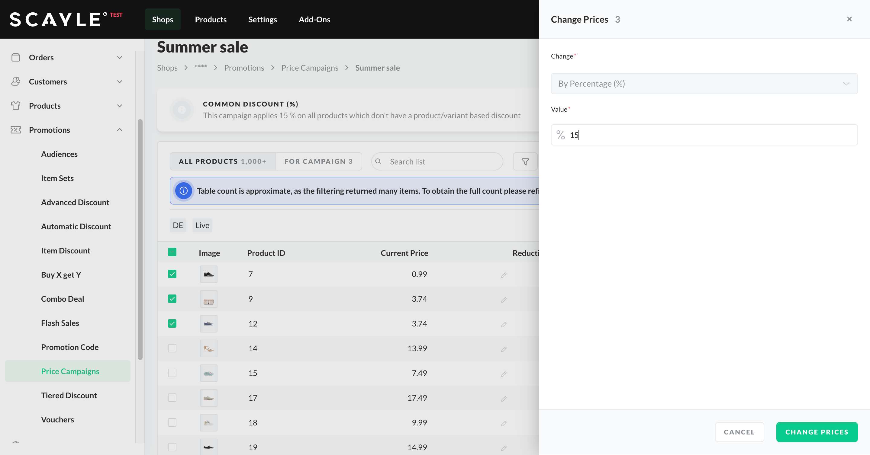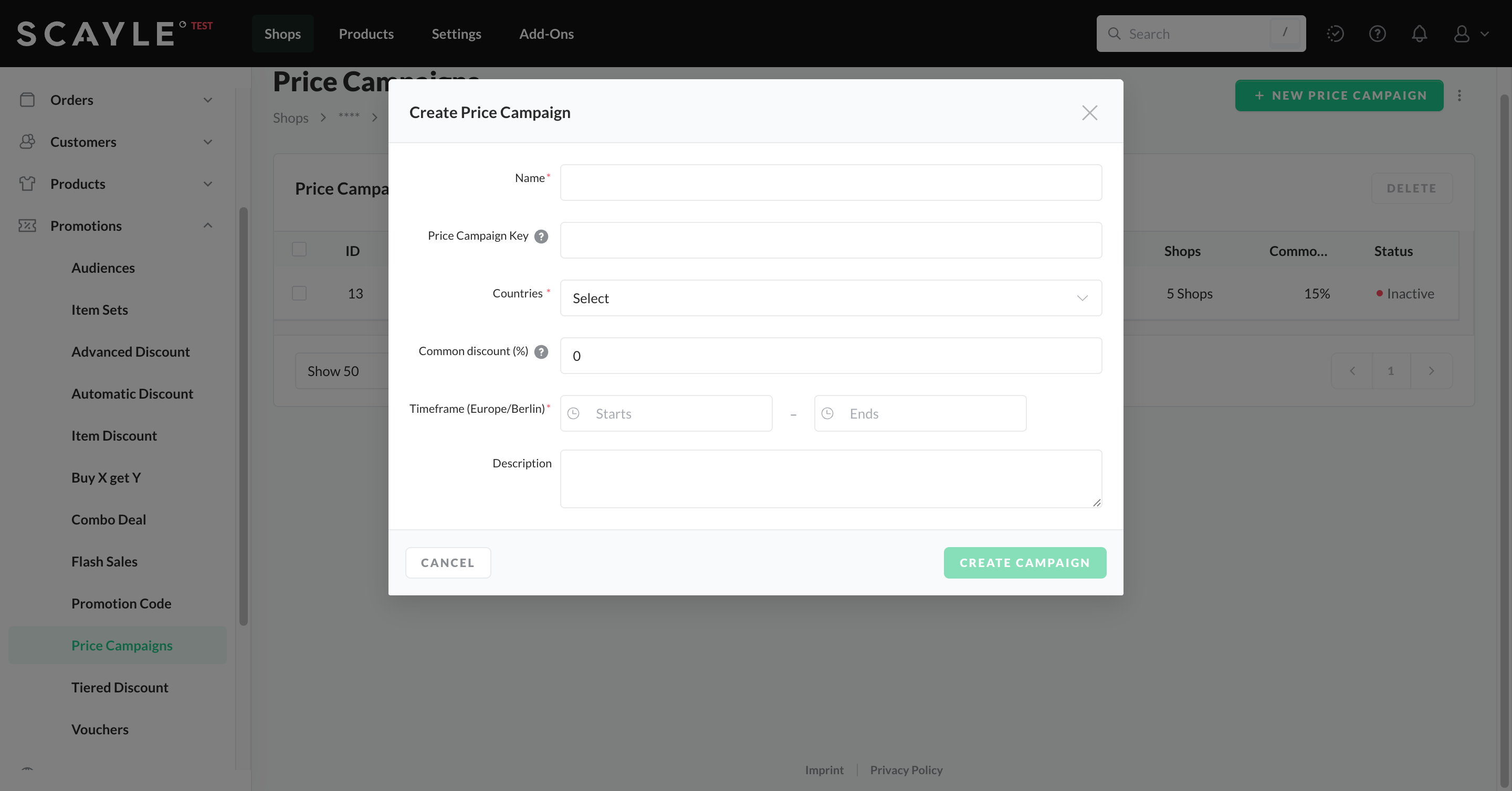 In the SCAYLE Panel navigate to Shops and select the shop you want to create a Price Campaign for. On the left hand side menu select Promotion ➜ Price Campaign.