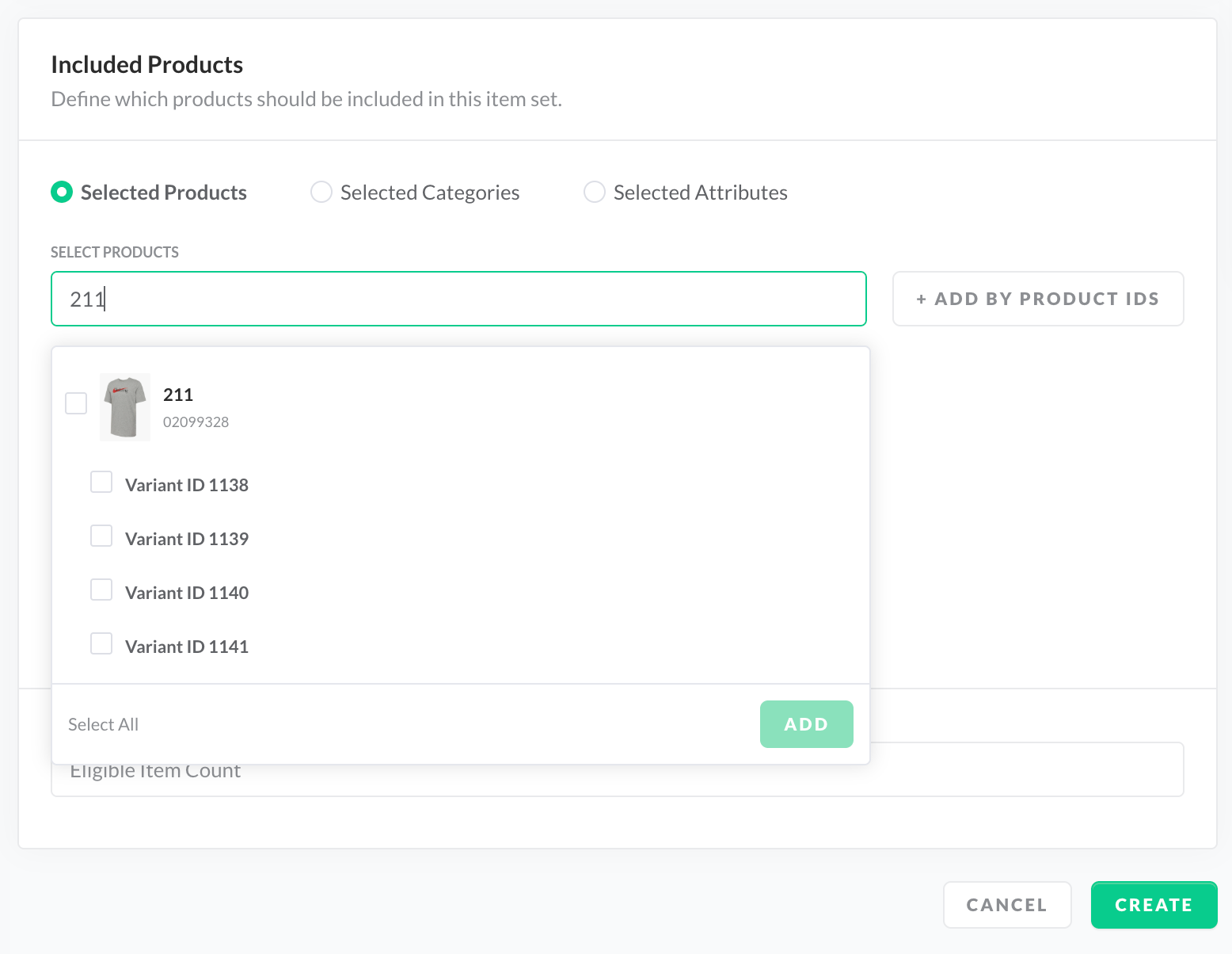 You can refine your product selection by choosing specific variants or by product ID, as well as by attributes within attributes. Selecting a shop category or attribute includes all products within that category or with that attribute in the item set. Unlike specifying products by ID, this creates a dynamic mapping where any new products in the category or with the attribute are automatically included.