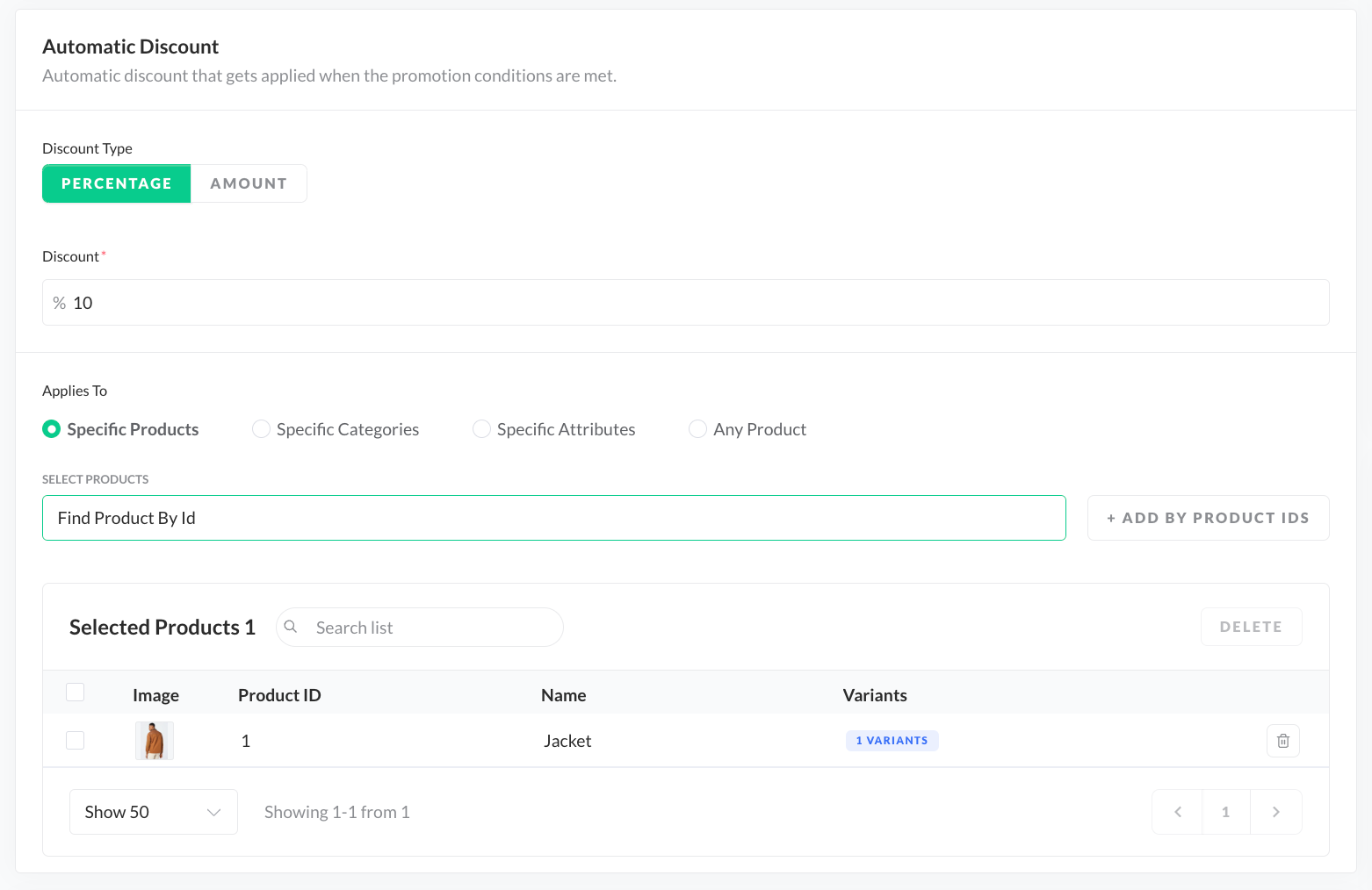 - Specific Product: The promotion will be applied in case specific Product IDs or Product Variants are bought