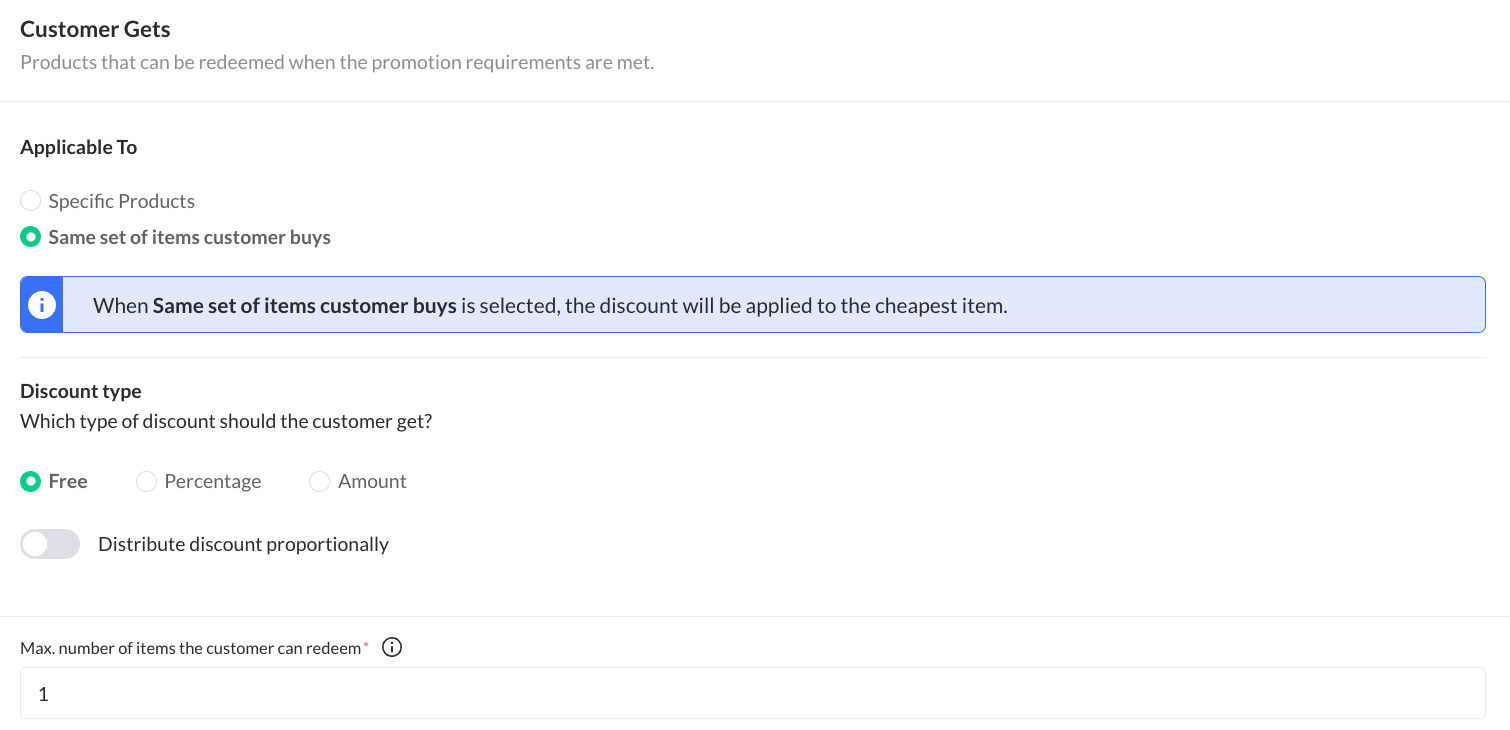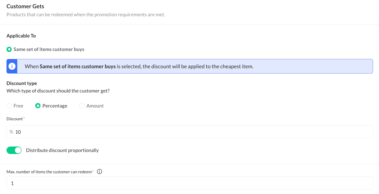 - Same set of Customer Buys: the promotion will be applied to the cheapest item from the set the customer is buying (e.g. buy 2 T-shirts of a specific brand and get 10% of discount on the 3rd one)