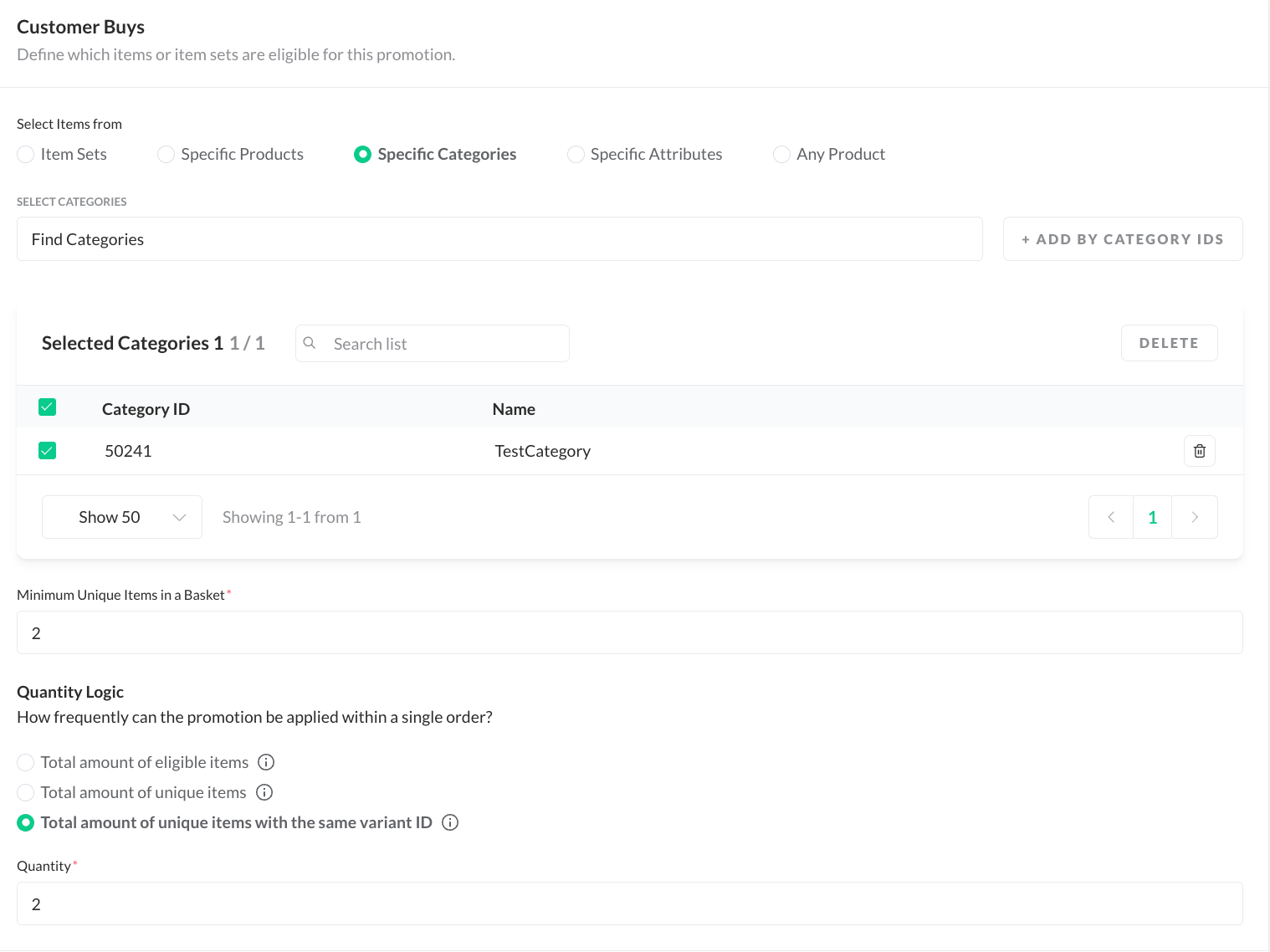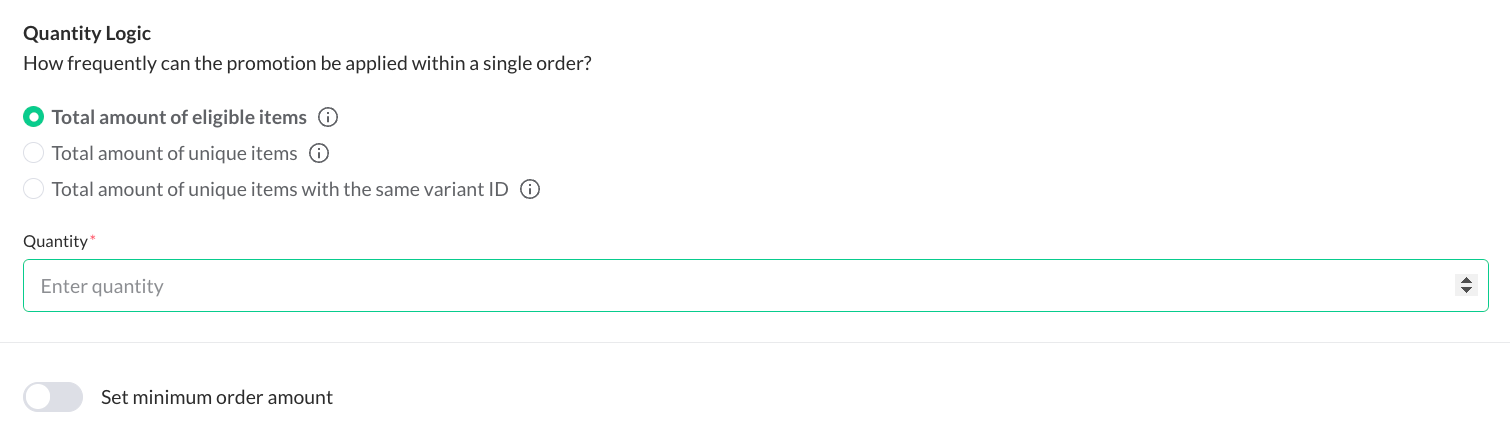 - As the promotion will only be enabled in case 2 items from the same variant ID will be bought, select the "Total amount of Unique items with the same variant ID" as Quantity Logic