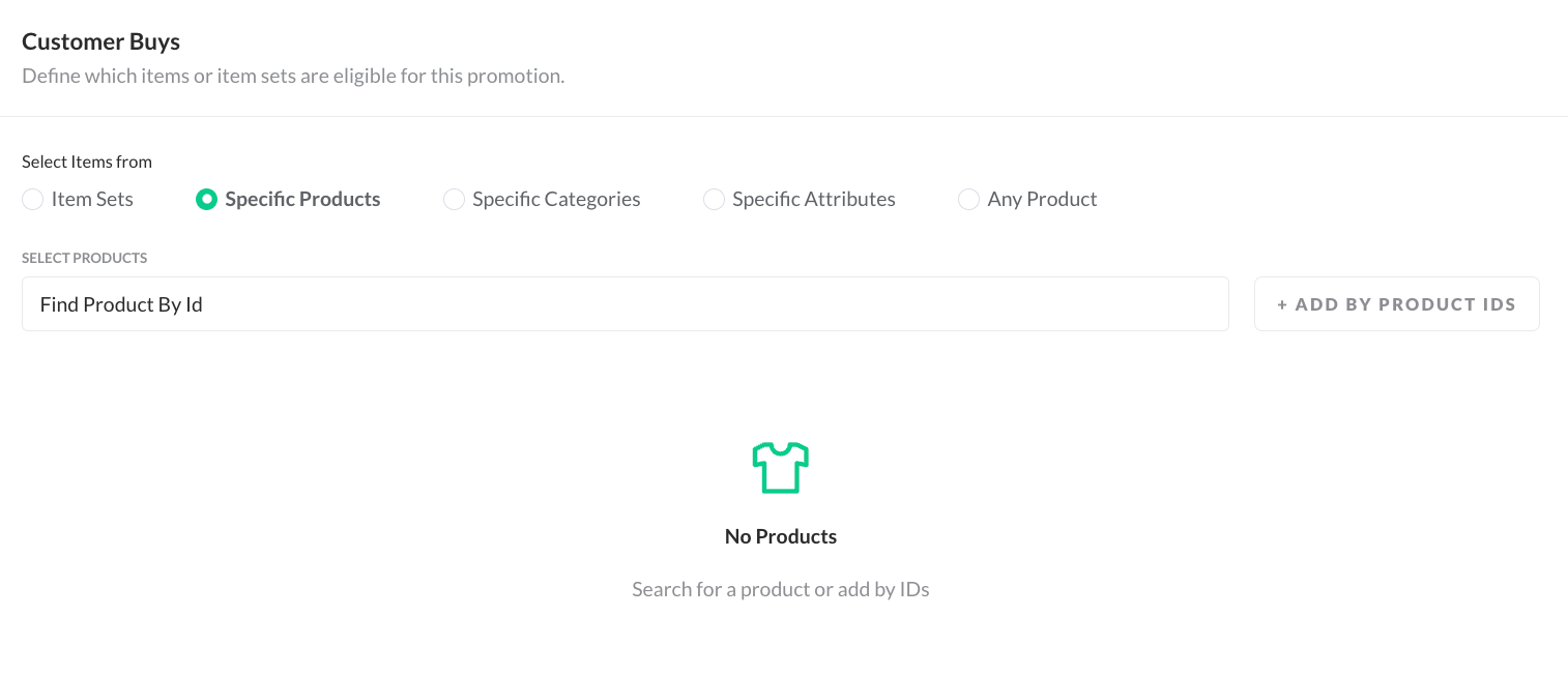 - Specific Product: The promotion will be applied in case specific Product IDs or Product Variants are bought
