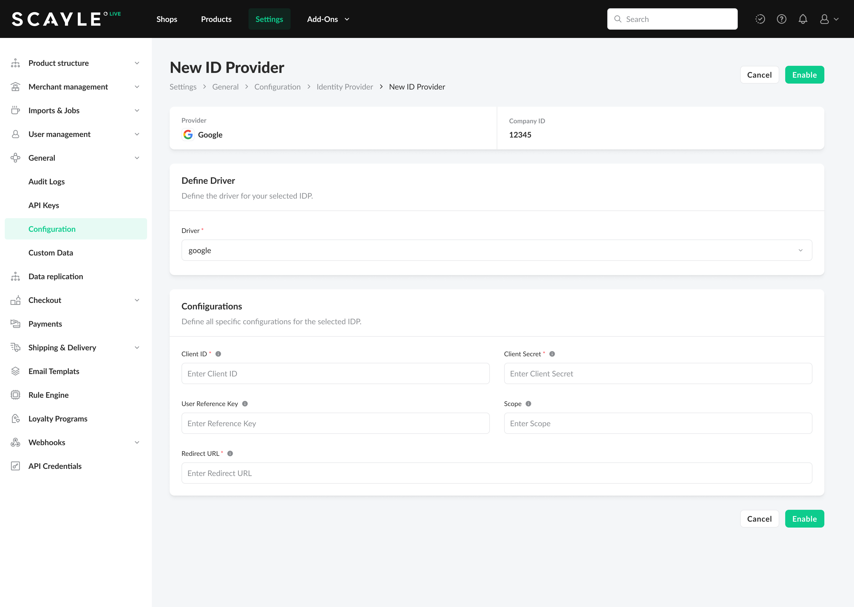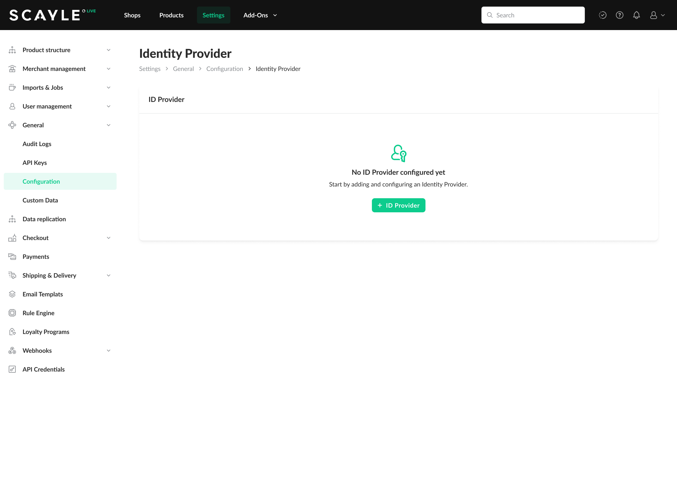 This can be done in the SCAYLE Panel under Settings ➜ General ➜ Configuration ➜ Identity Provider.