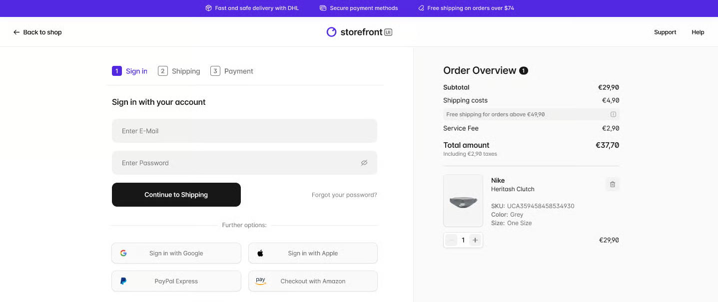 - Flexible Configuration - Supports Single-Sign-On with preconfigured Identity Provider, Express Payment Methods, and Dynamic Input Fields for user registration and guest login flows.