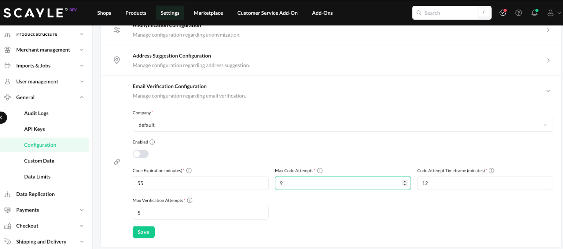 Email verification behavior is fully configurable in the SCAYLE Panel, including expiry time, attempt limits, and code generation caps. This can be configured under General ➜ Configuration ➜ Email Verification Configuration.