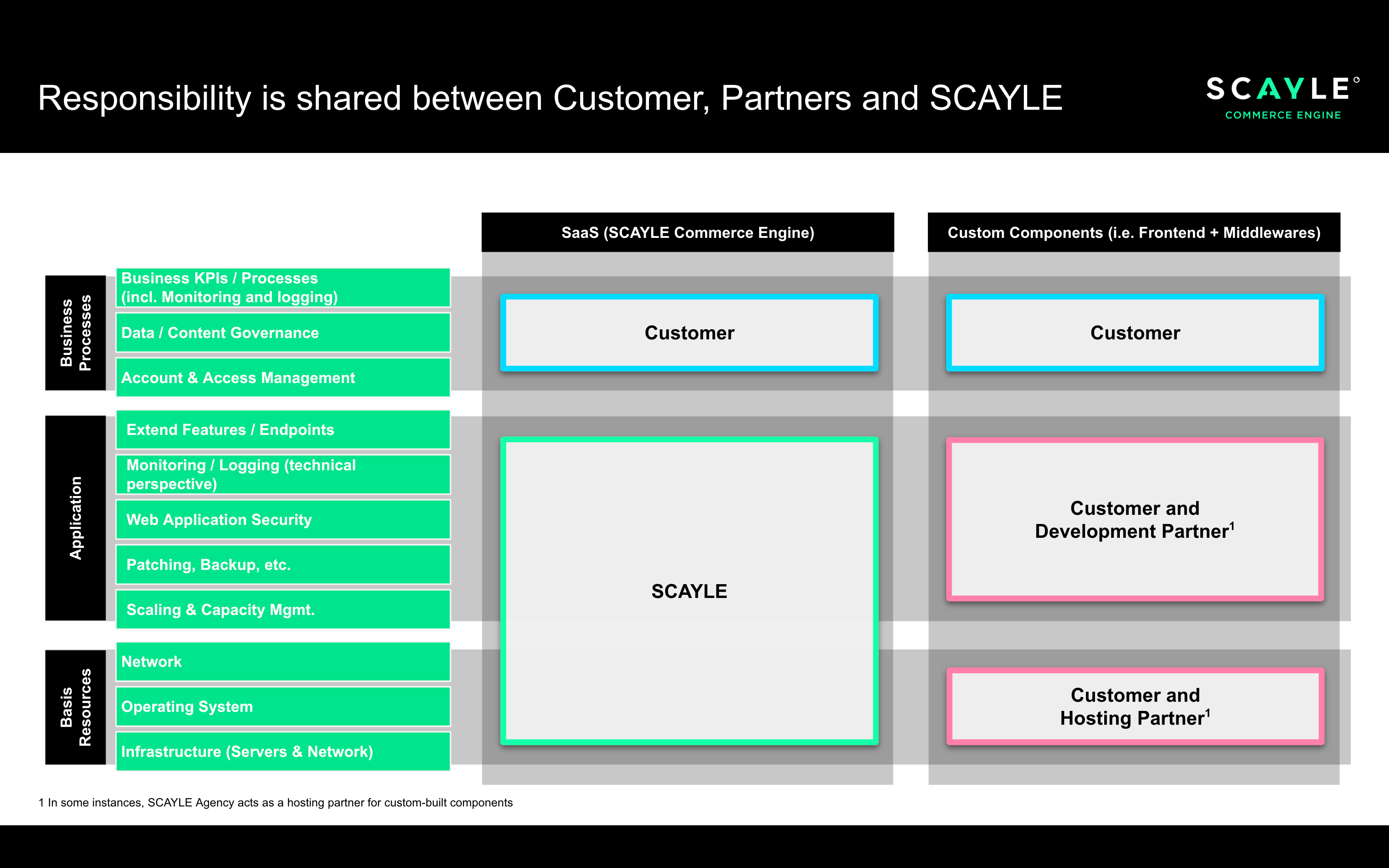 - Secure Configuration: SCAYLE takes responsibility for the secure configuration of the systems maintained by SCAYLE and made available to the tenant. The tenant is responsible for the configuration of the systems connecting to SCAYLE’s API, Checkout configuration, and other shop configurations.