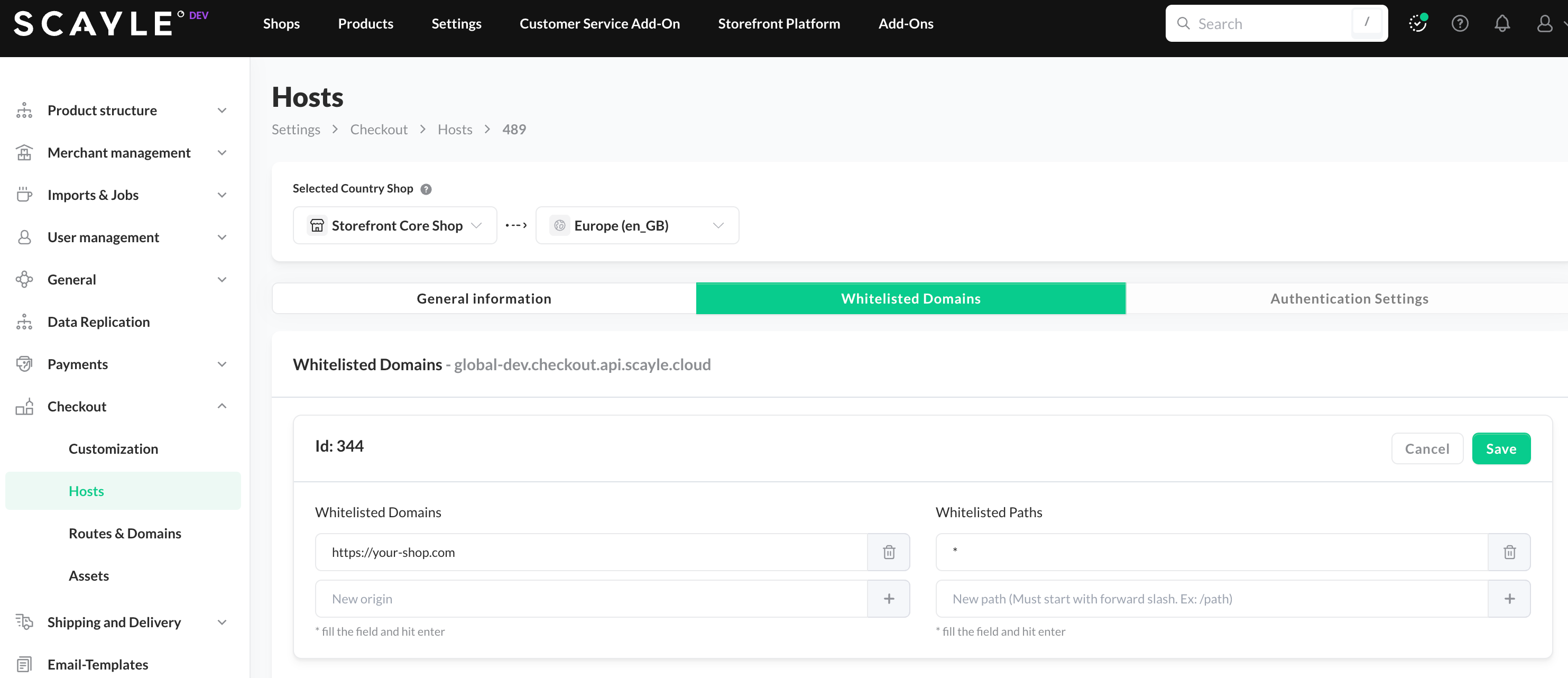 - Why it's necessary: Your SCAYLE Checkout will be accessed and interacted with directly from your shop's website (your frontend storefront). For the browser to allow these cross-origin requests to the SCAYLE API, your storefront's domain must be explicitly approved.